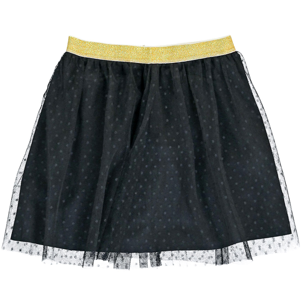 Dievčenská sukňa s bohato nariasenou tylovou vrstvou. Bavlnená podšívka. Jemný, pružný tyl s potlačou drobných zlatých bodiek. V páse guma.Dodatočné parametre