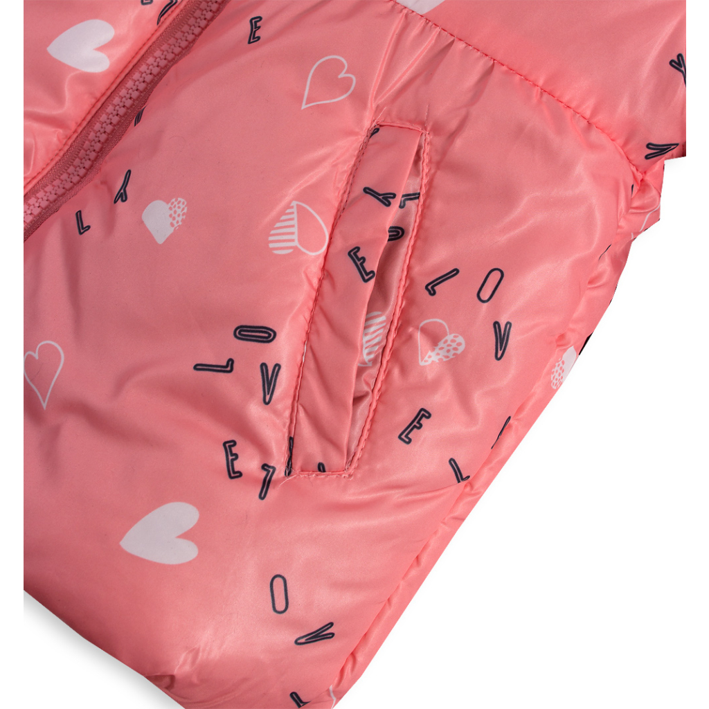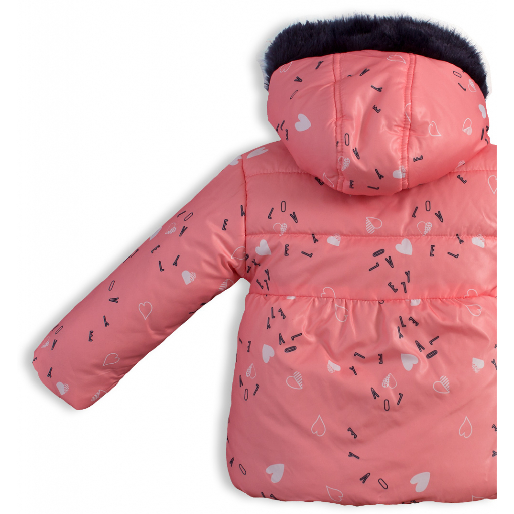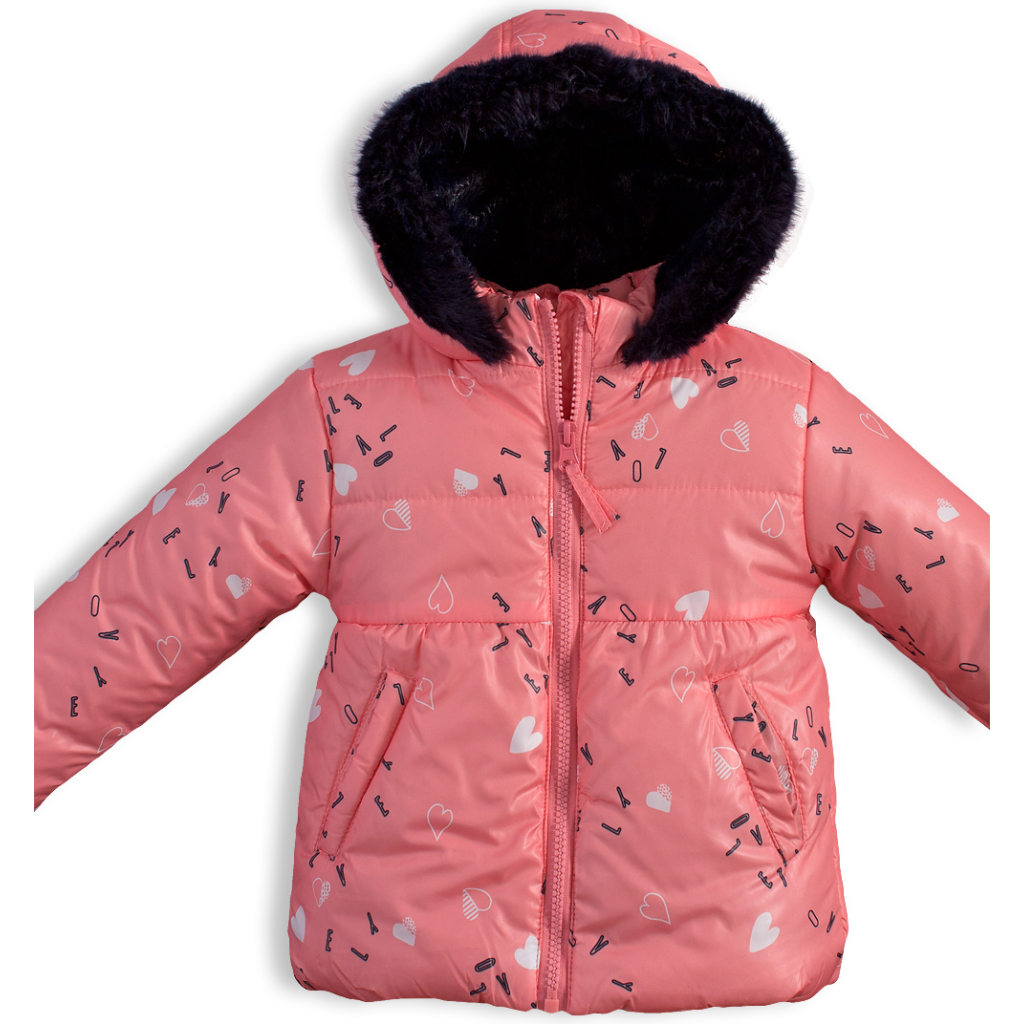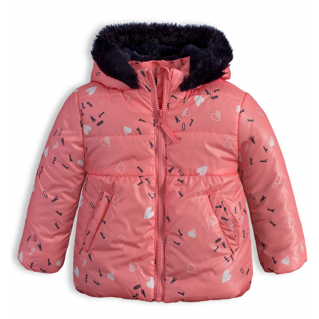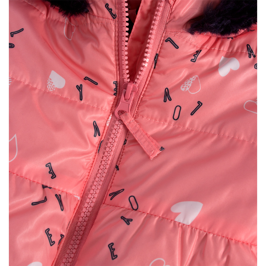 Zimná bunda pre malé slečny. Zapínanie na zips. Kapucňa s kožušinovým lemom. Funkčné vrecká. Šuštiak s potlačou srdiečok. Podšívka z jemnej kožušinky. V rukávoch šuštiak pre ľahké obliekanie.