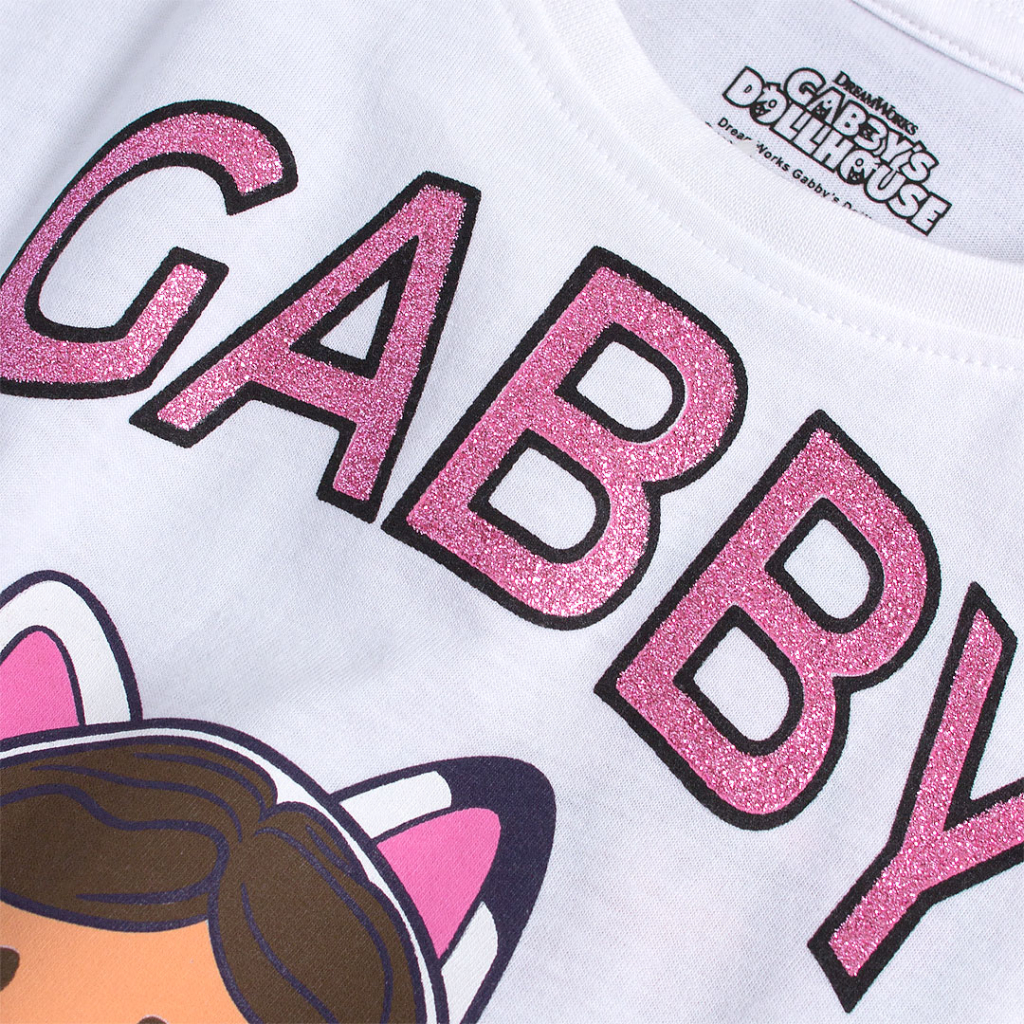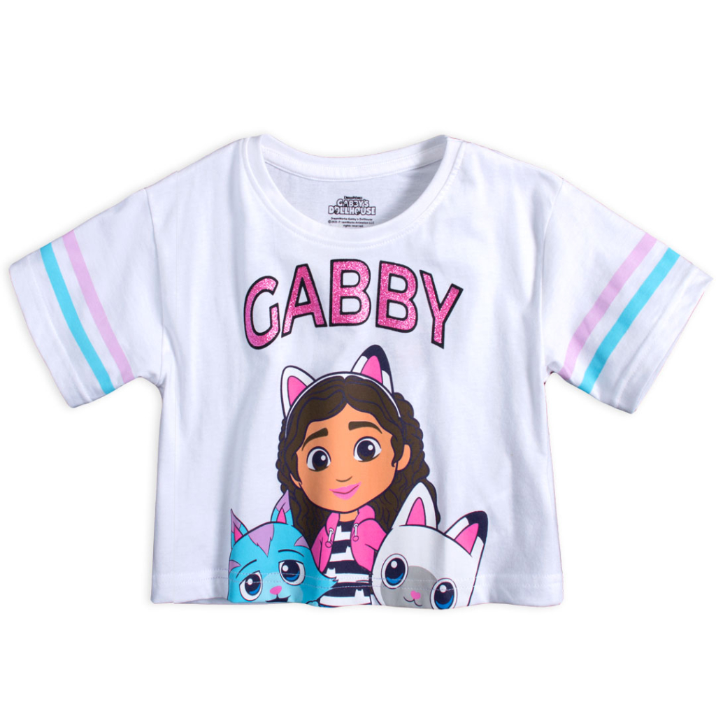 Dievčenské crop tričko s farebným obrázkom Gábinky z animovaného seriálu GABBYS DOLLHOUSE. Kratší, voľnejší strih. Bavlnený úplet.