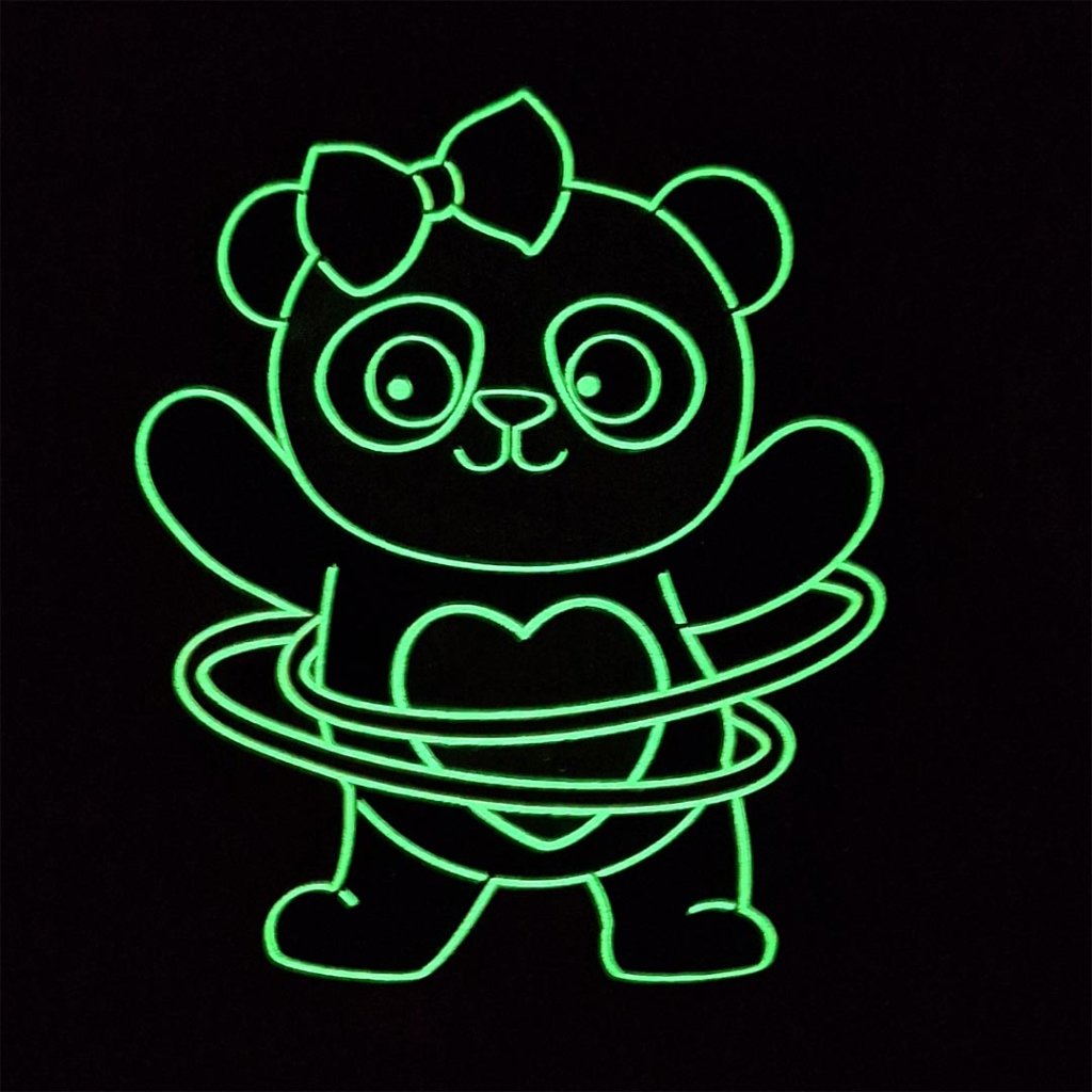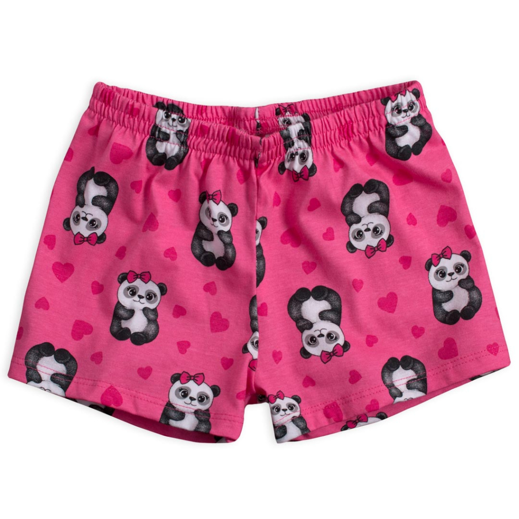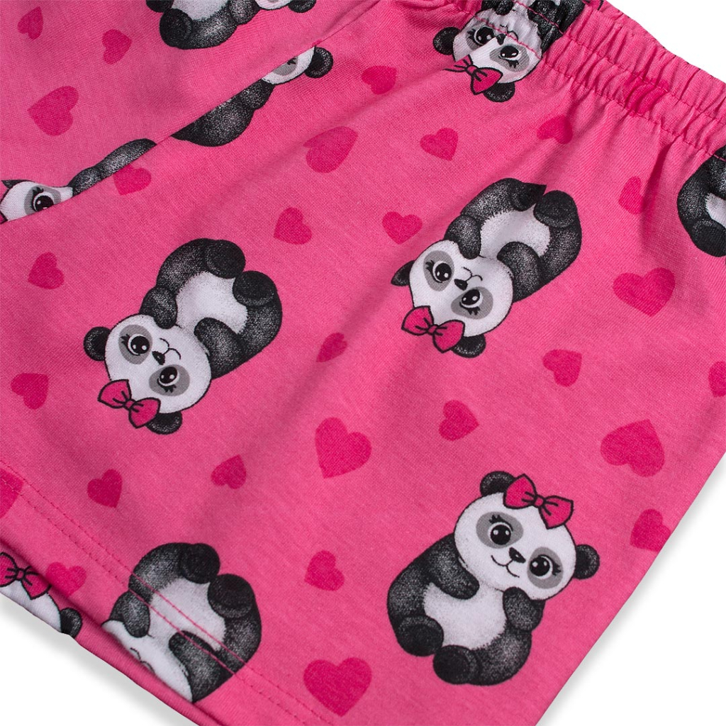Dievčenské pyžamo s pandou. Tričko s krátkym rukávom, pohodlný, mierne rozšírený strih. Obrysy pandy v tme svietia. Šortky na gumu, s drobnejšou potlačou. Bavlnený úplet. Vyrobené v Brazílii.Dodatočné parametre