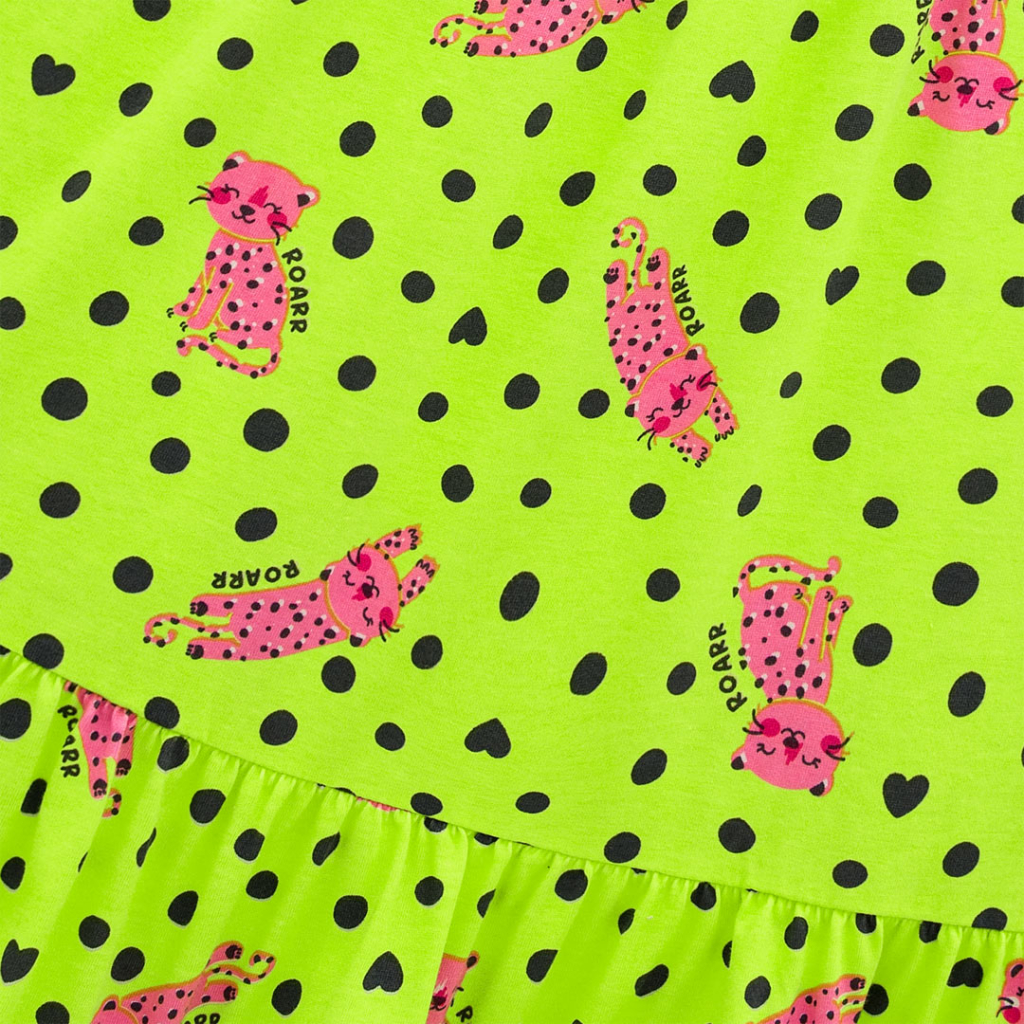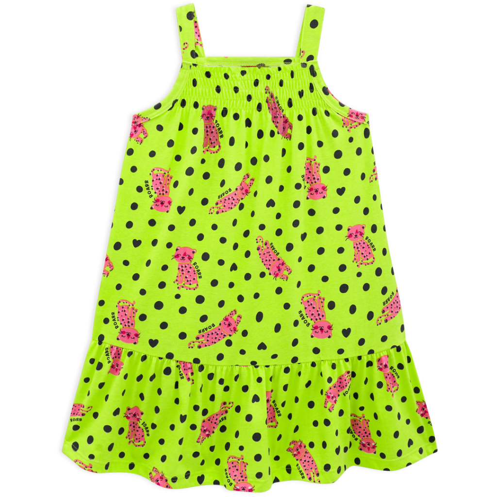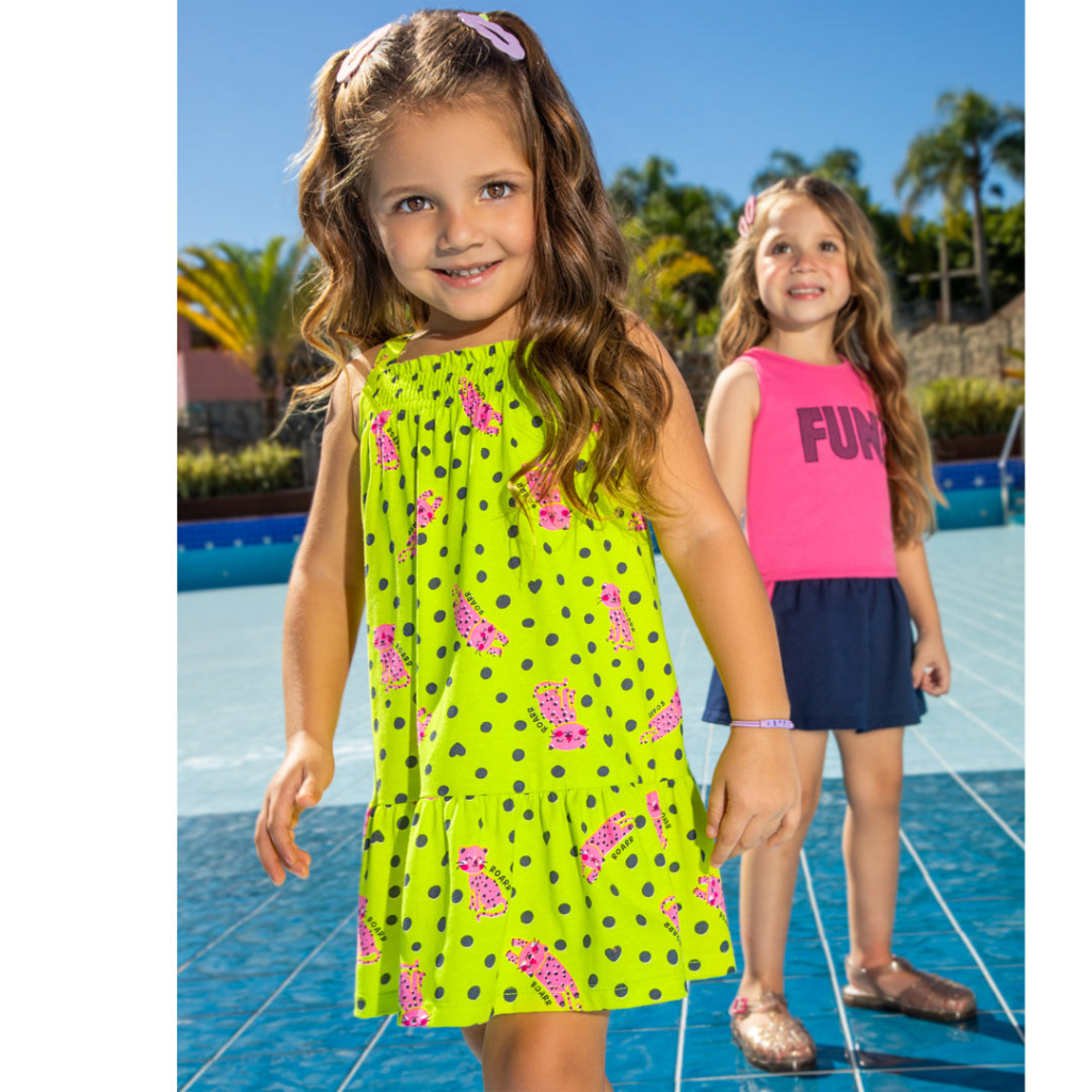 Dievčenské šaty na ramienka. Pohodlný, vzdušný strih so žabičkováním pri výstrihu. Dole našitý volán. Ľahký, mäkký úplet s potlačou. Vyrobené v Brazílii.Dodatočné parametre