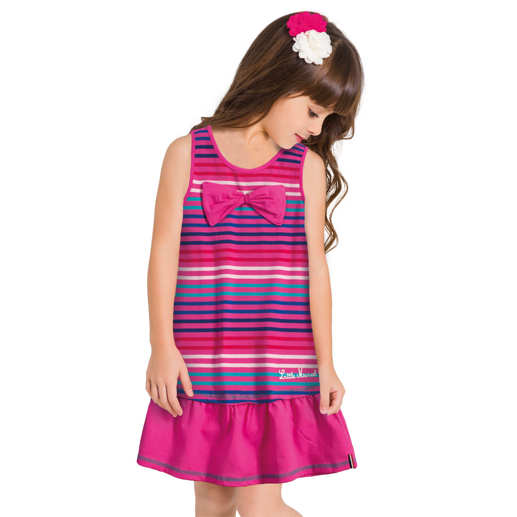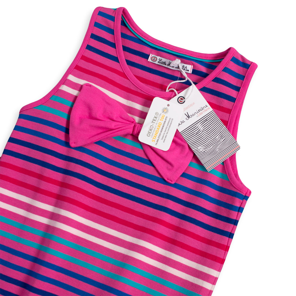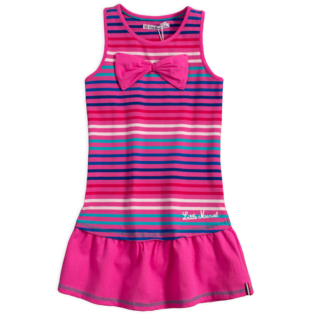 Krásne letné šaty bez rukávov s našitou mašľou. Francúzska módna značka LITTLE MARCEL. Veľmi príjemný pruhovaný úplet, dole našitý jednofarebný volán. Dosť pružný materiál.