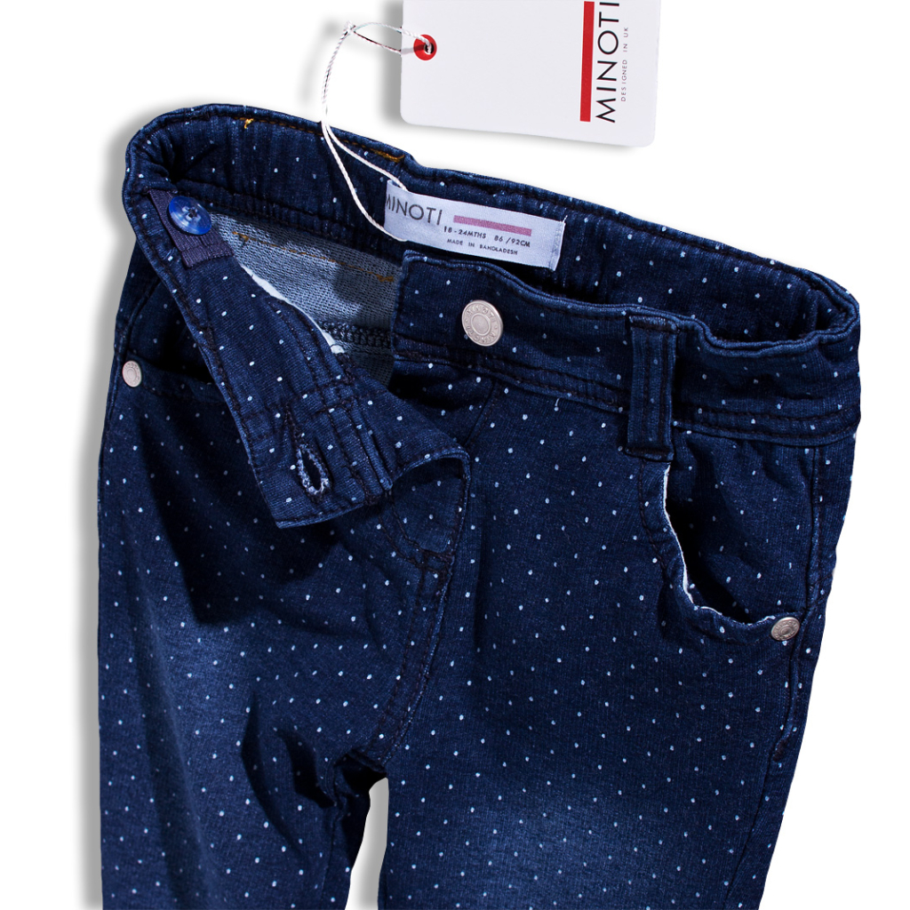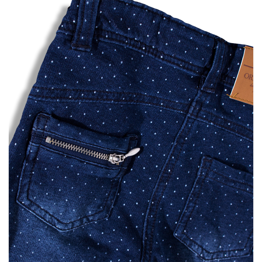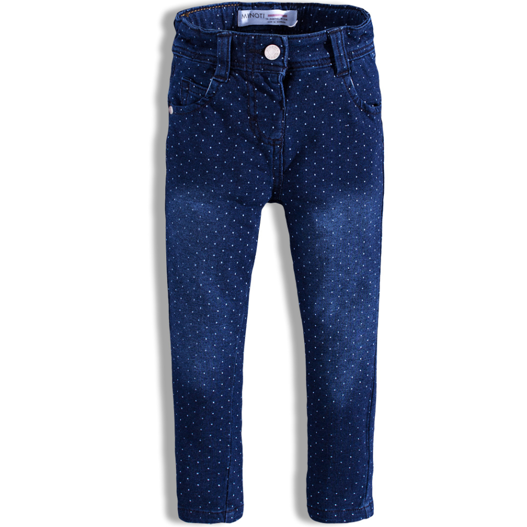 Dievčenské elastické nohavice - jeggings. V páse zapínanie na gombík, sťahovacia guma. Funkčné vrecká vpredu i vzadu. Potlač drobných bodiek. Od veľkosti 98/104 je cena 16,50 €.