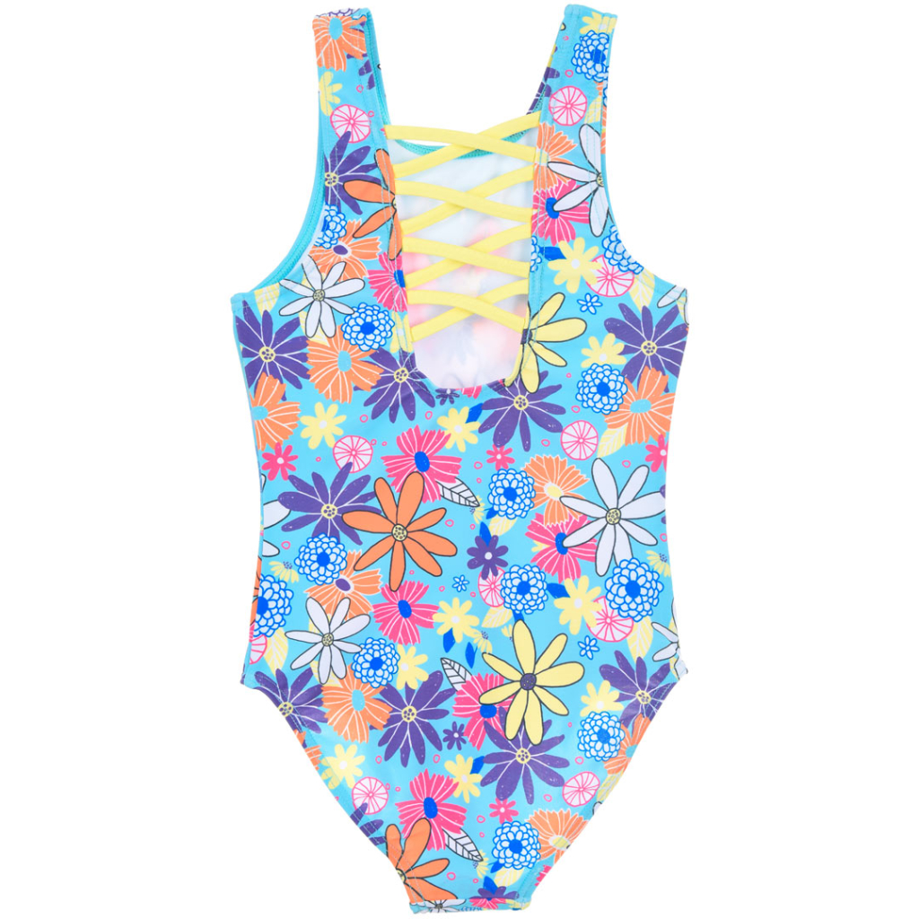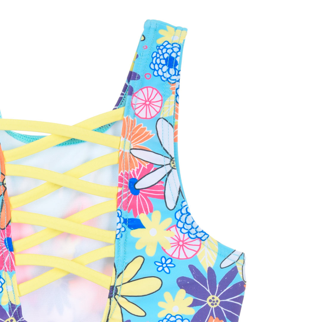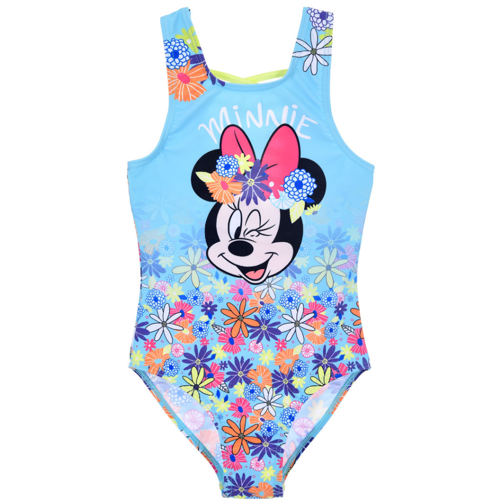 Jednodielne dievčenské plavky s myškou Minnie a farebnými kvetinkami. Na chrbte zaujímavý detail prekríženia.Dodatočné parametre