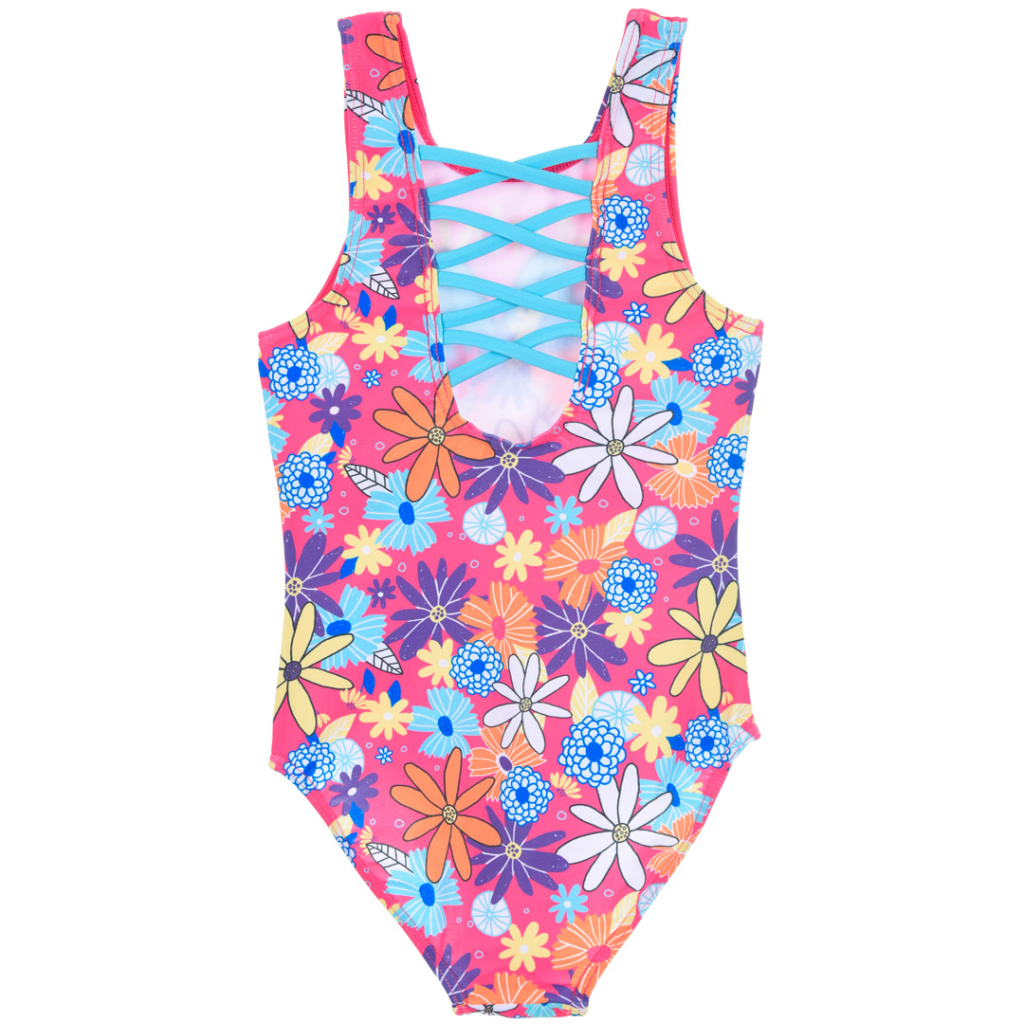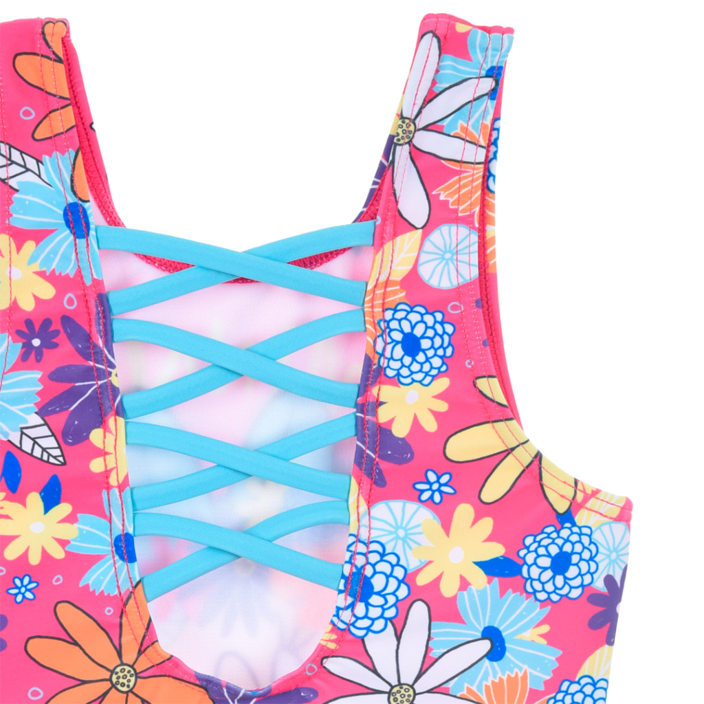 Jednodielne dievčenské plavky s myškou Minnie a farebnými kvetinkami. Na chrbte zaujímavý detail prekríženia.Dodatočné parametre