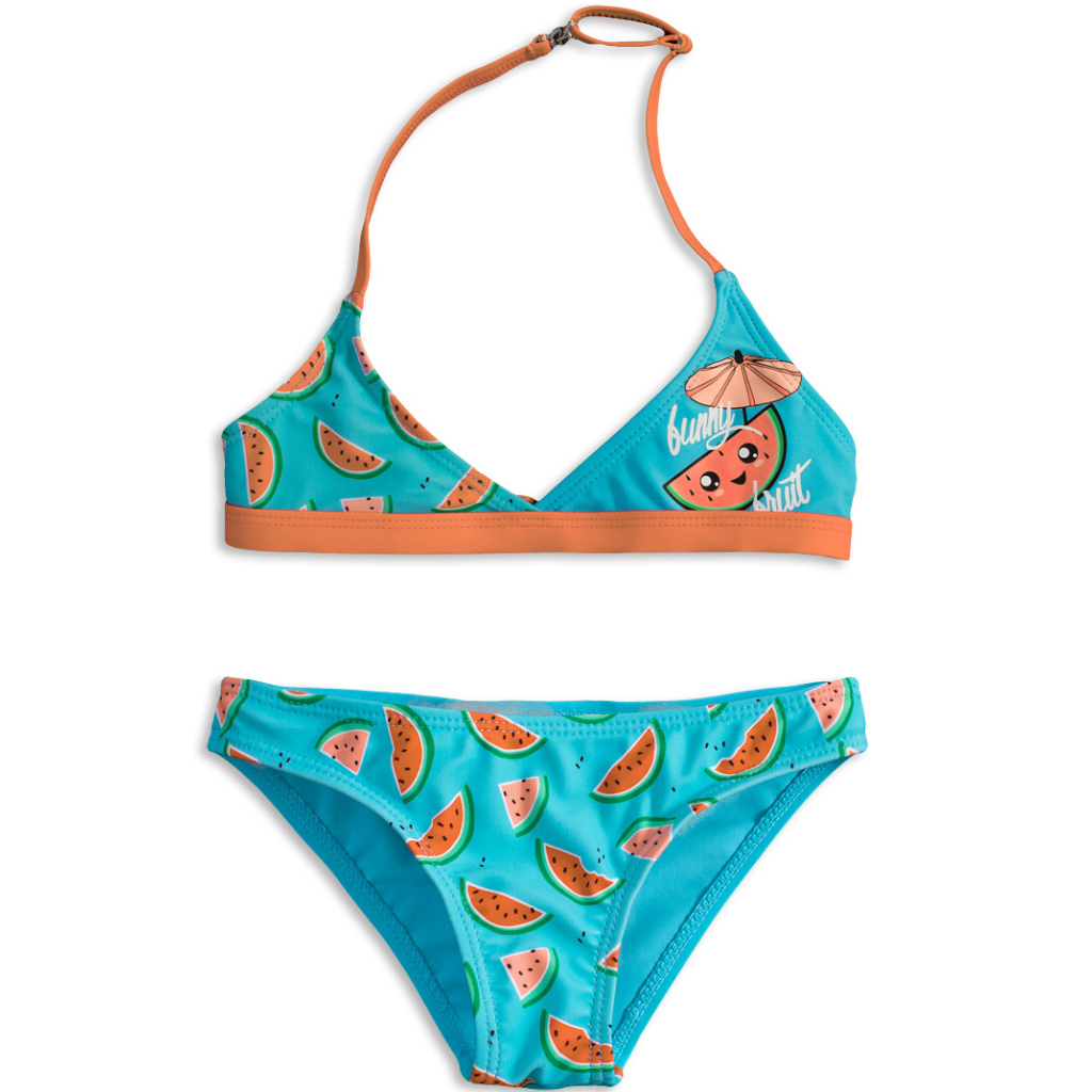 Dvojdielne dievčenské plavky. Podprsenka má rozopínacie ramienko za krk s nastaviteľnou dĺžkou a zapínanie na chrbte. Nohavičky s potlačou vpredu, zadný diel jednofarebný.