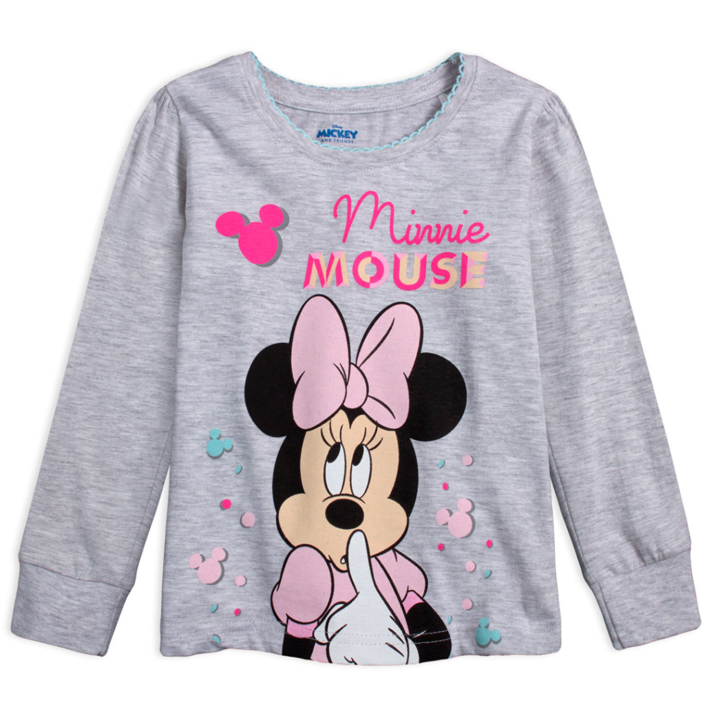 Krásne pyžamo pre dievčatá s veľkým obrázkom myšky Minnie. Pruhované nohavice v páse s mašličkou. Tričko z melírového šedého úpletu s veľkou potlačou Minnie, pri krku zakončené ozdobným lemom. Príjemný, bavlnený úplet.Dodatočné parametre