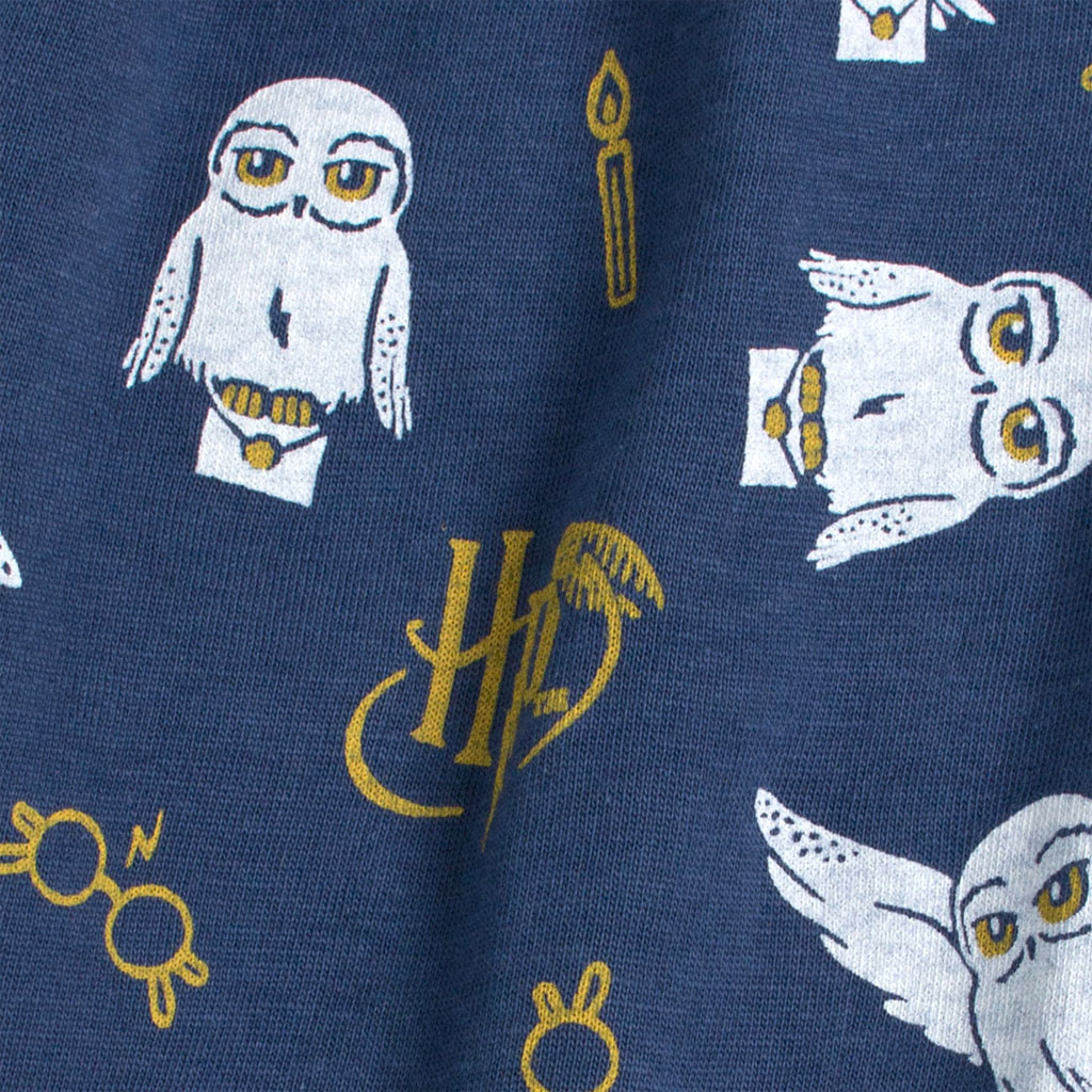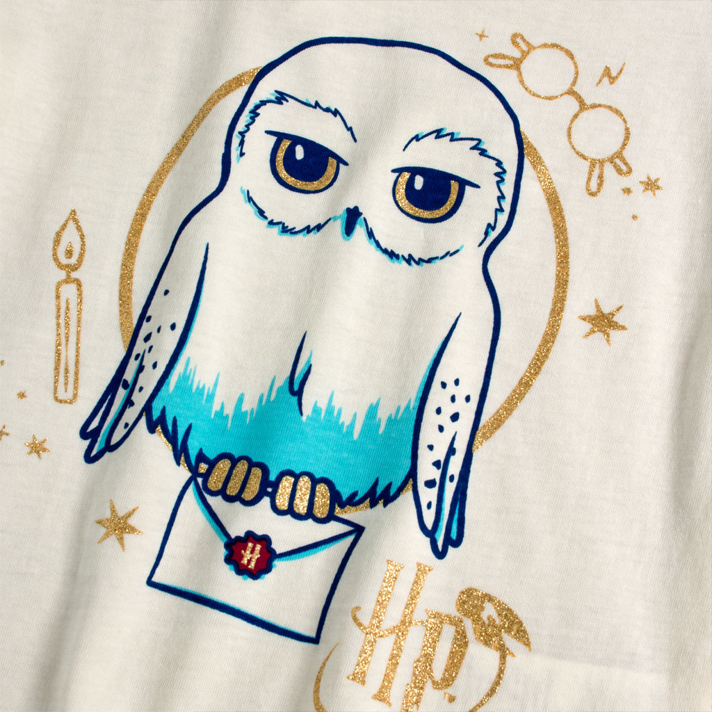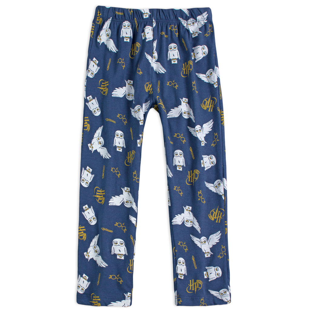 Krásne dievčenské pyžamo so sovou Hedvigou z obľúbeného Harryho Pottera. Trblietavá, zlatistá potlač s logom Harry Potter na oboch dieloch. Príjemný, bavlnený úplet.Dodatočné parametre