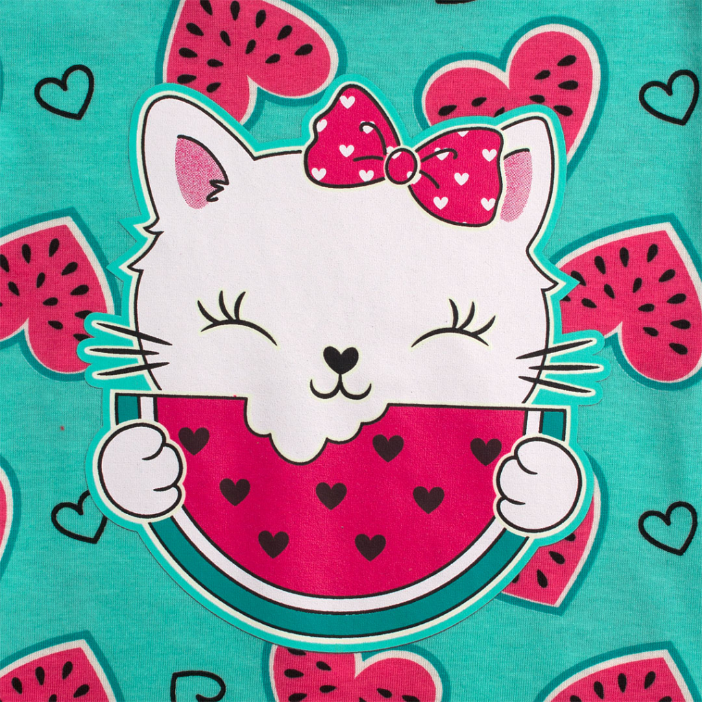 Krásne dievčenské pyžamo s potlačou. Obrysy mačičky na tričku v tme svietia. Pohodlné šortky s melónovými srdiečkami. Bavlnený úplet. Vyrobené v Brazílii.Dodatočné parametre
