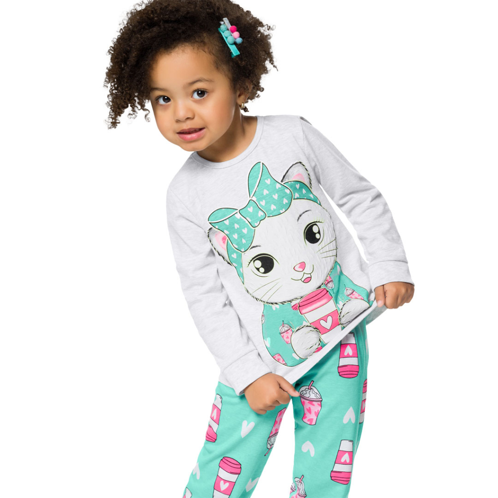 Dievčenské pyžamo s krásnou potlačou. Svetielkujúce detaily na vrchnom diele. Dlhý rukáv i nohavice, pružné patenty. Mäkký, príjemný materiál. Vyrobené v Brazílii.Dodatočné parametre