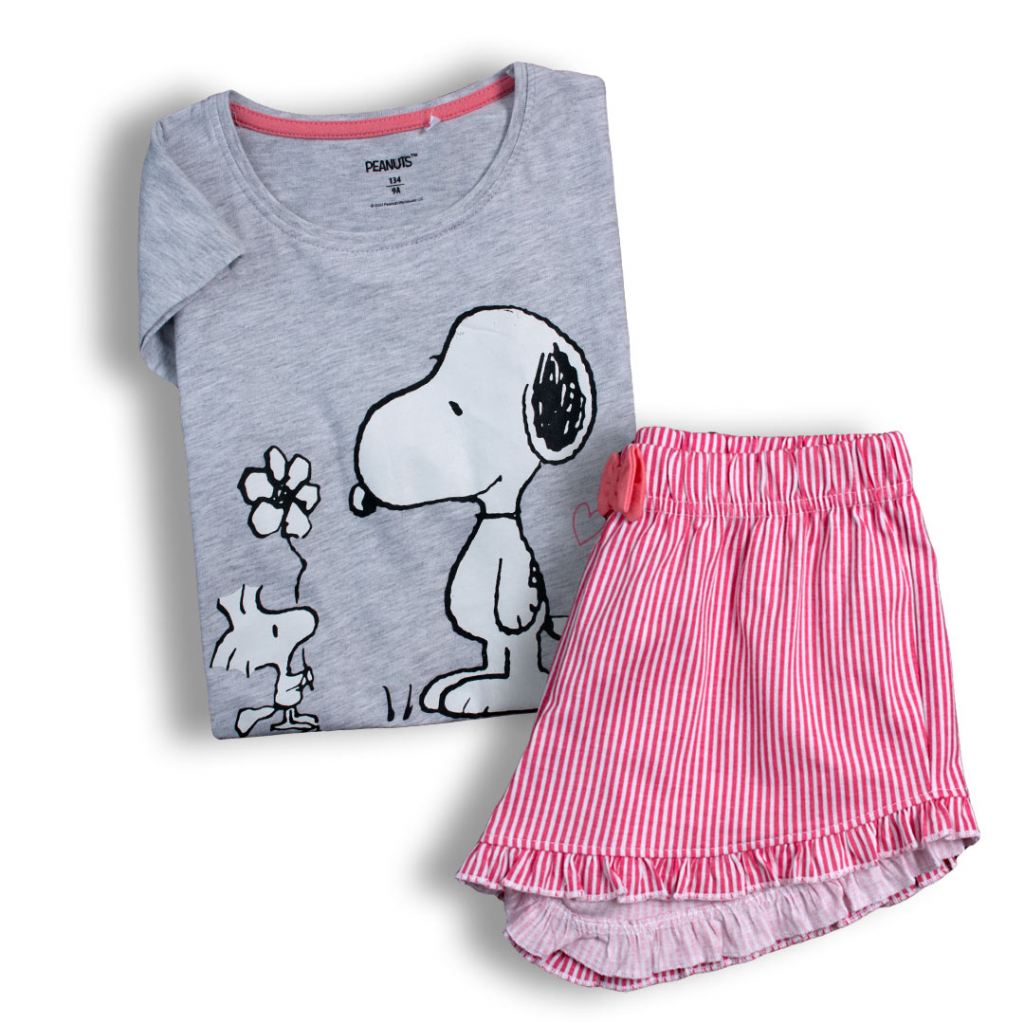 Dievčenské pyžamo so psíkom Snoopy. Tričko s krátkym rukávikom, s obrázkom. Pohodlné prúžkované šortky s volánikom, v páse našitá mašlička.Dodatočné parametre