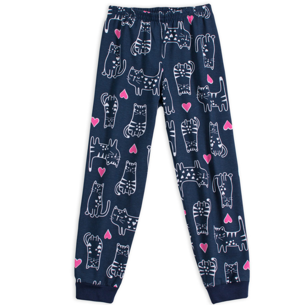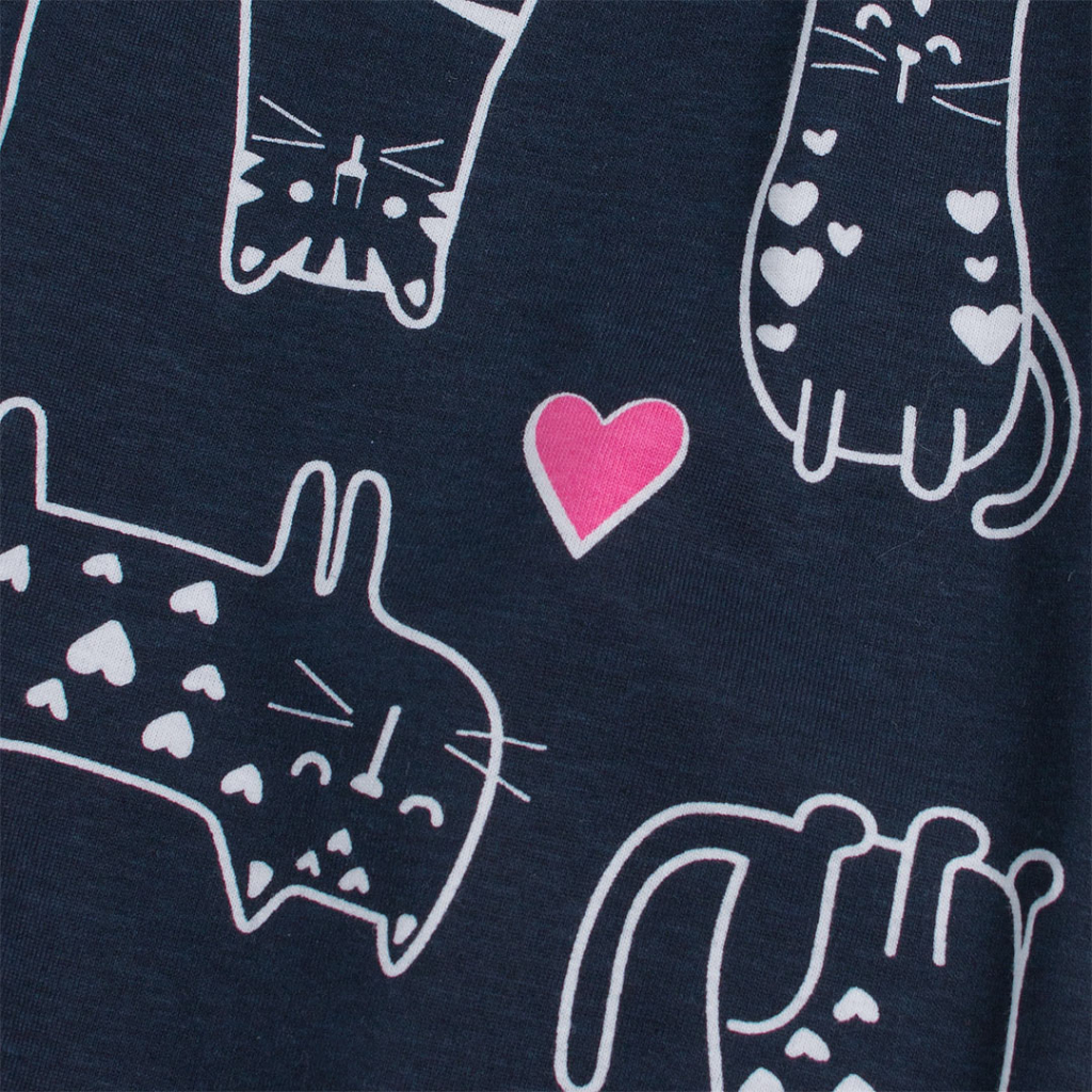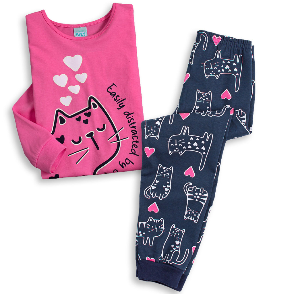 Bavlnené dievčenské pyžamo s potlačou mačičky. Tričko s dlhým rukávom, mierne rozšírený strih. Dlhé nohavice s pružnými patentami. Obrysy obrázku na tričku v tme svietia. Vyrobené v Brazílii.