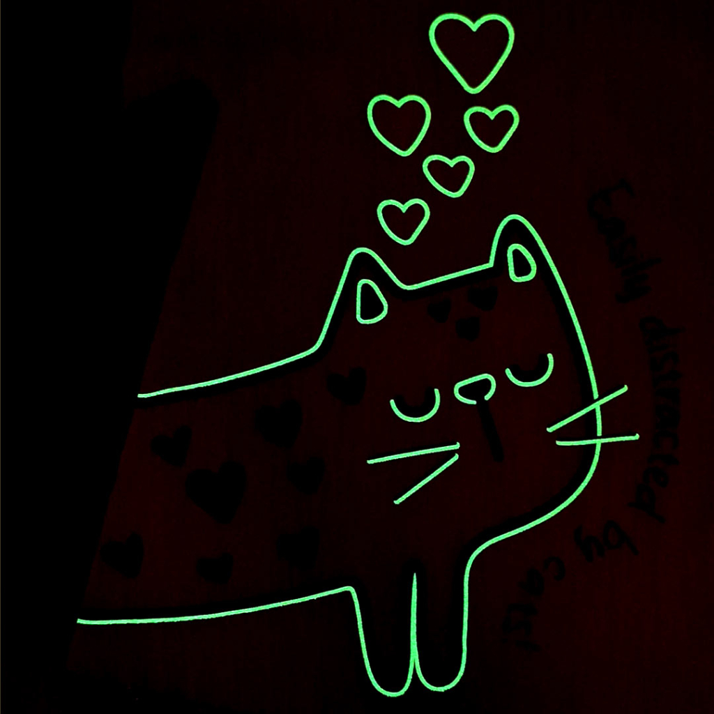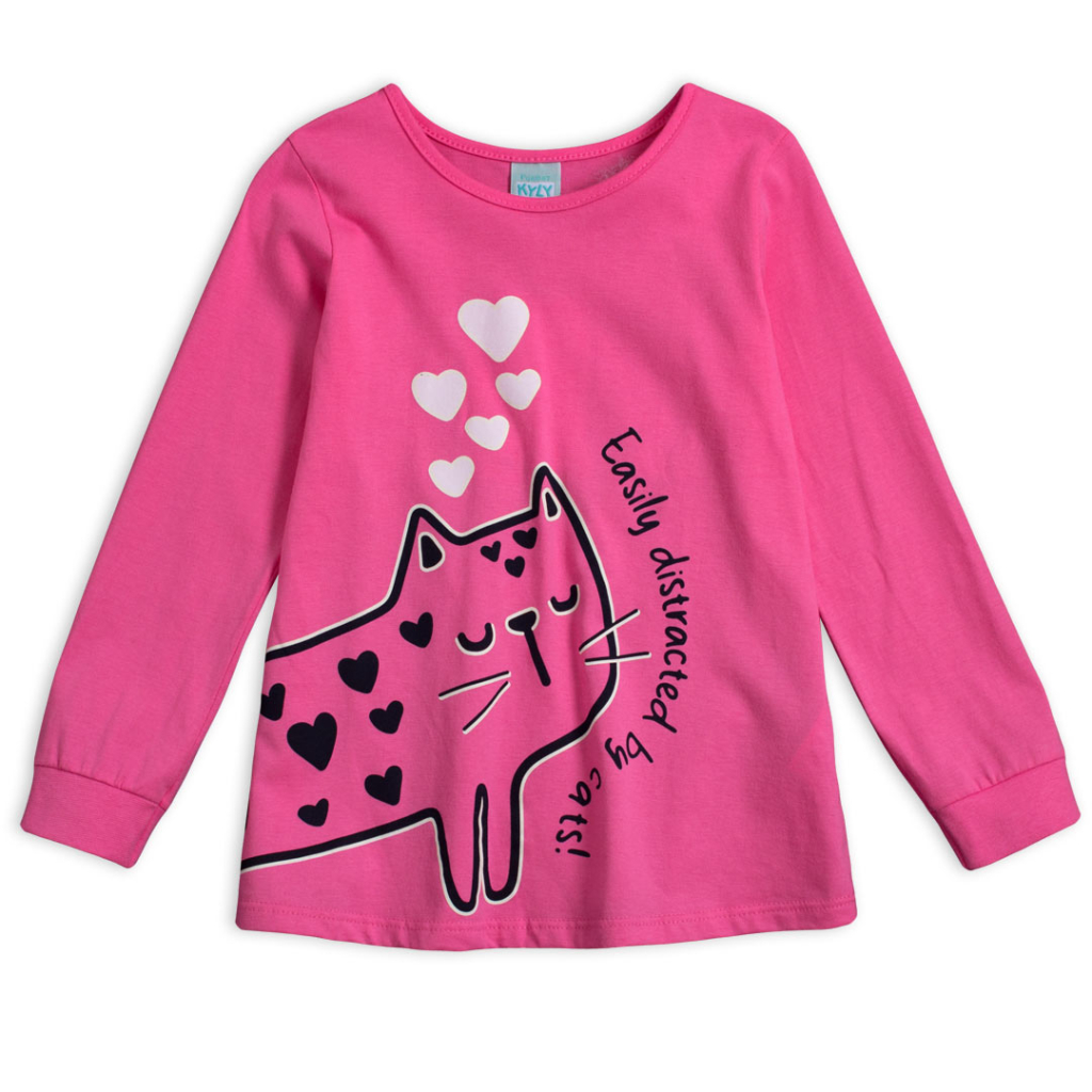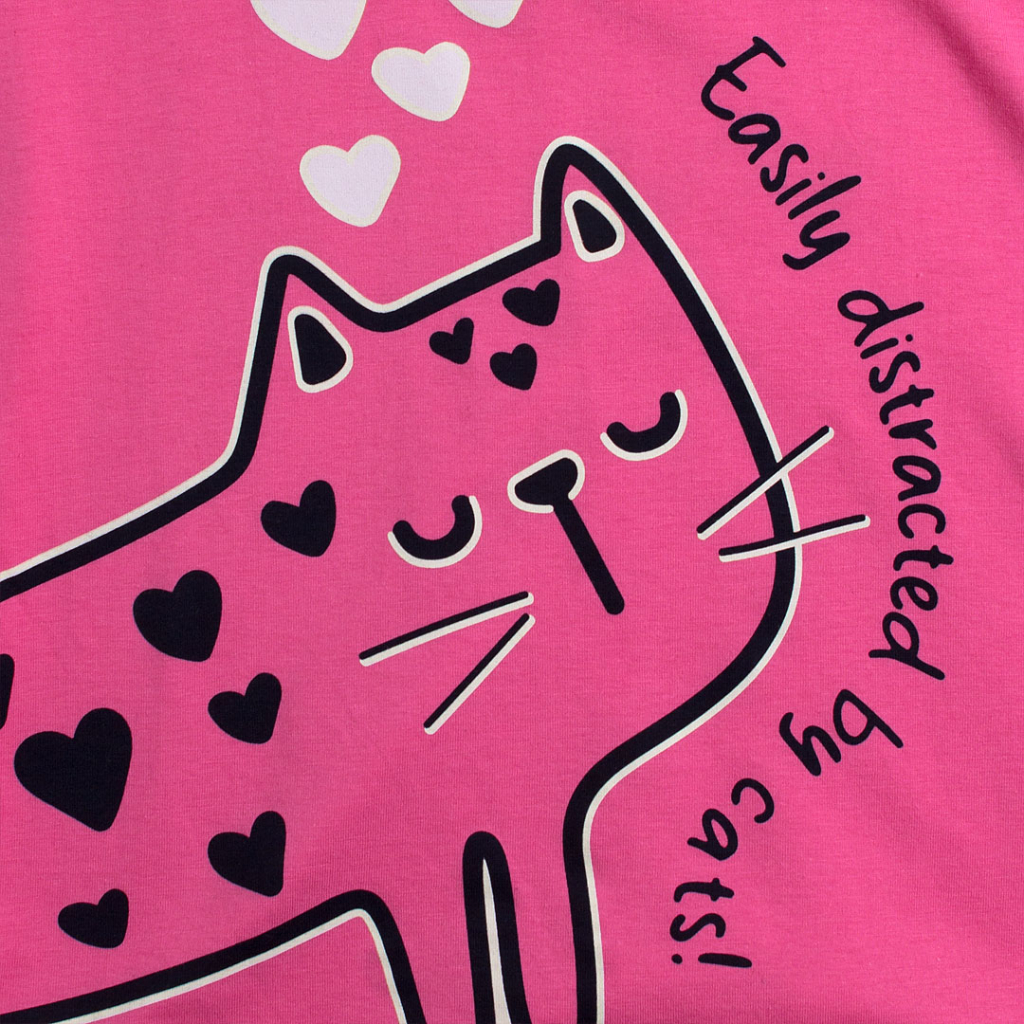 Bavlnené dievčenské pyžamo s potlačou mačičky. Tričko s dlhým rukávom, mierne rozšírený strih. Dlhé nohavice s pružnými patentami. Obrysy obrázku na tričku v tme svietia. Vyrobené v Brazílii.