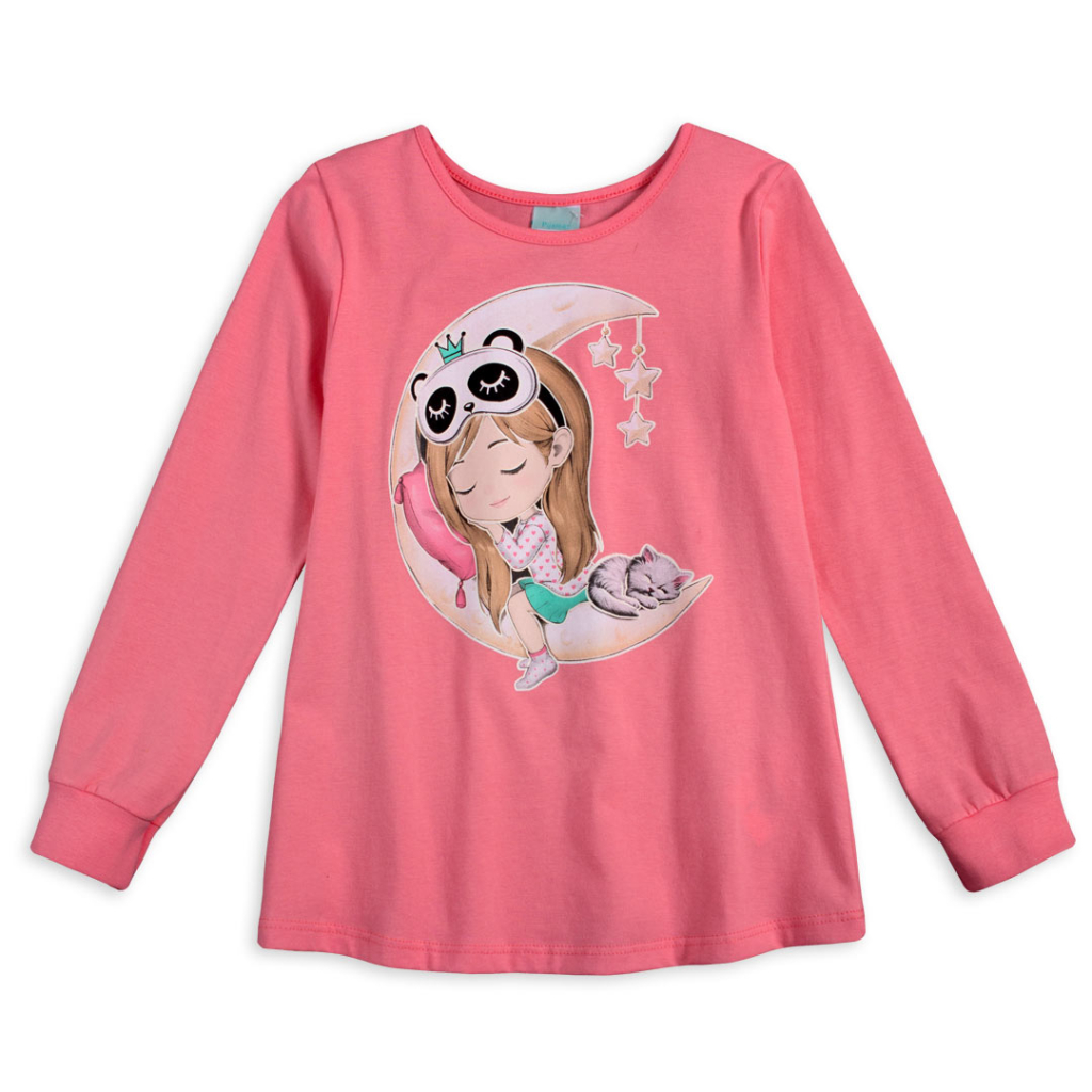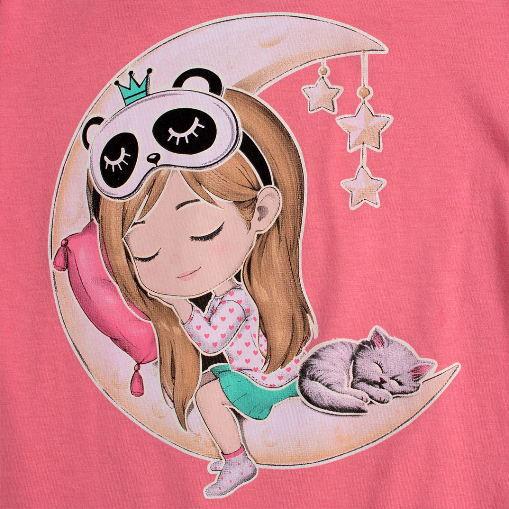 Pohodlné dievčenské pyžamo s krásnym obrázkom. Obrysy na tričku v tme svietia. Tričko je mierne rozšírené, s pružnými lemami. Mäkký bavlnený úplet. Vyrobené v Brazílii.