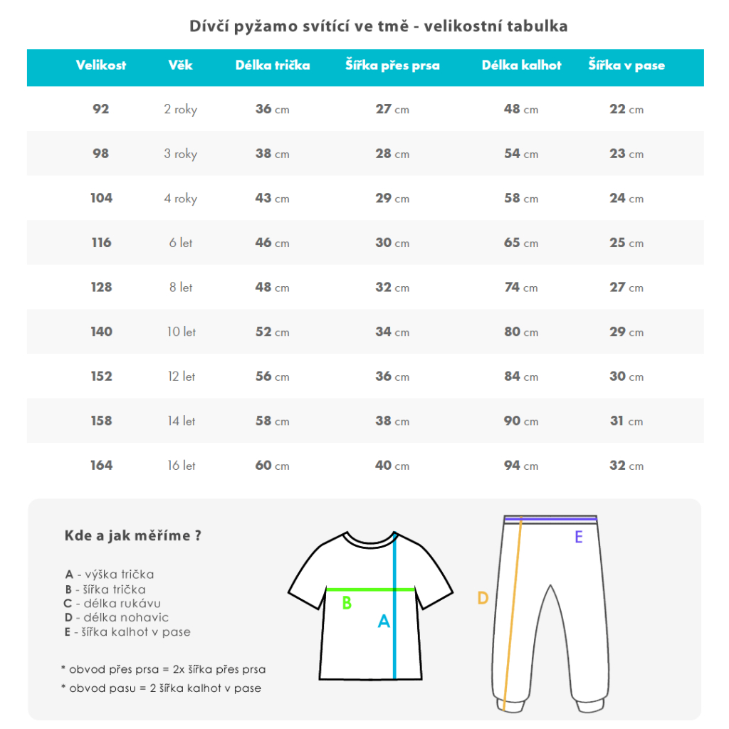 Krásne dievčenské pyžamko. Tričko s krátkym rukávom, obrysy obrázku v tme svietia. Nohavice s dlhými nohavicami, s pružnými patentami. Príjemný bavlnený úplet. Vyrobené v Brazílii.Dodatočné parametre