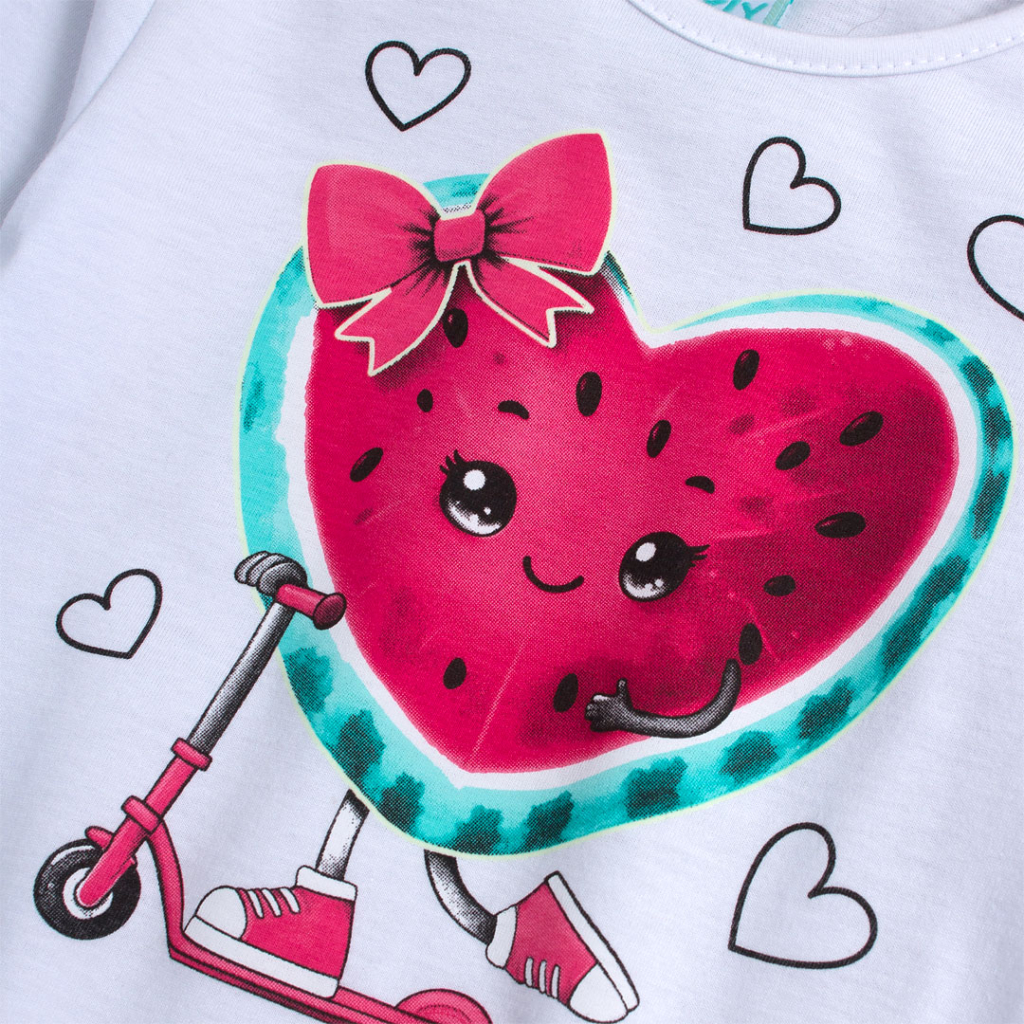 Dievčenské pyžamo s veselou potlačou melónových srdiečok. Obrysy obrázku na tričku v tme svietia. Rukávy i nohavice s pružnými patentami. Bavlnený úplet. Vyrobené v Brazílii.Dodatočné parametre