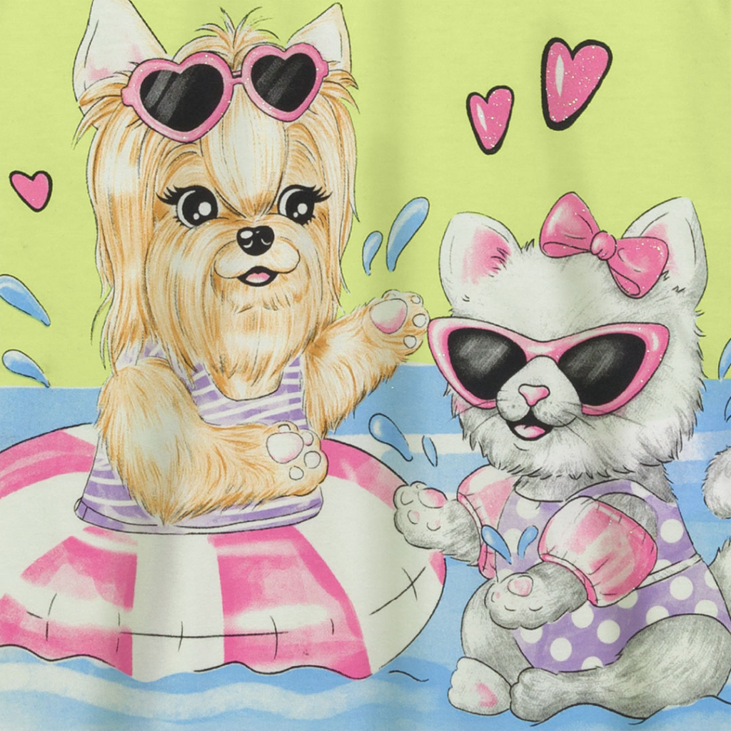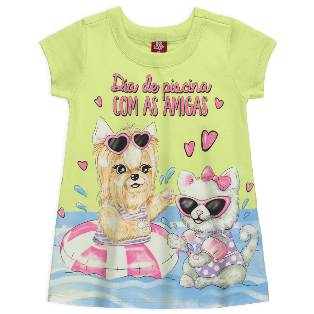 Dievčenské letné šaty s krátkym rukávom, z bavlneného úpletu. Utešená farebná potlač. Vyrobené v Brazílii.Dodatočné parametre