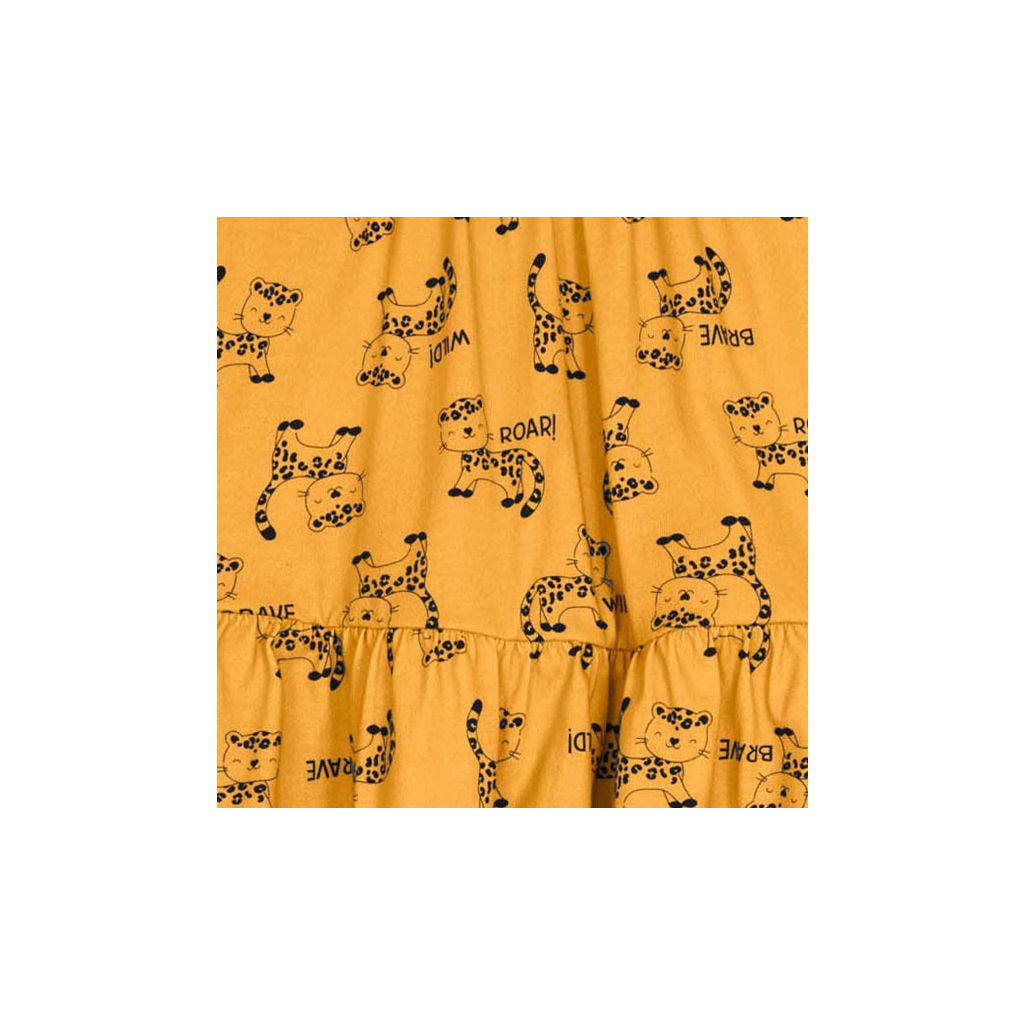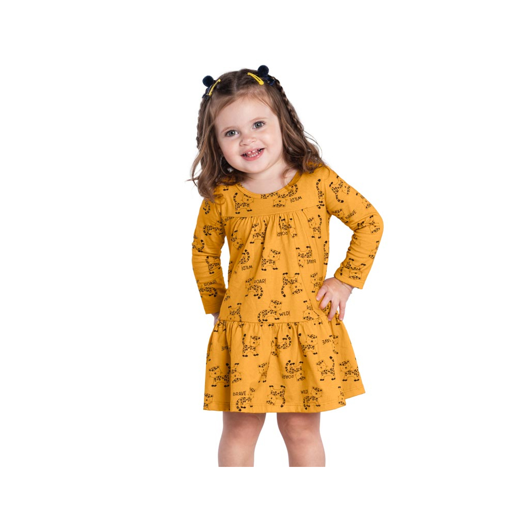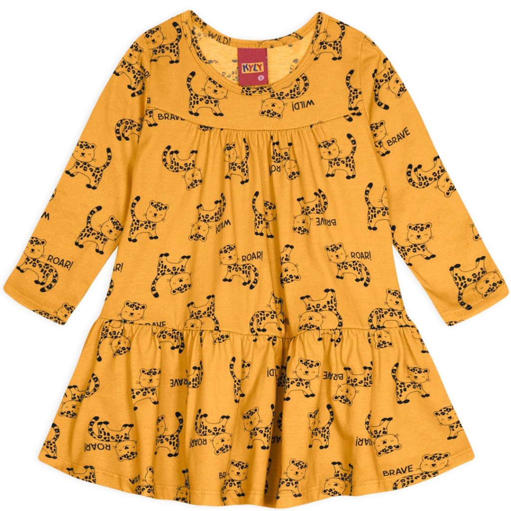 Dievčenské šaty s dlhým rukávom, s roztomilou potlačou. Rozšírený strih s volánom dole. Príjemný bavlnený úplet. Vyrobené v Brazílii.Dodatočné parametre
