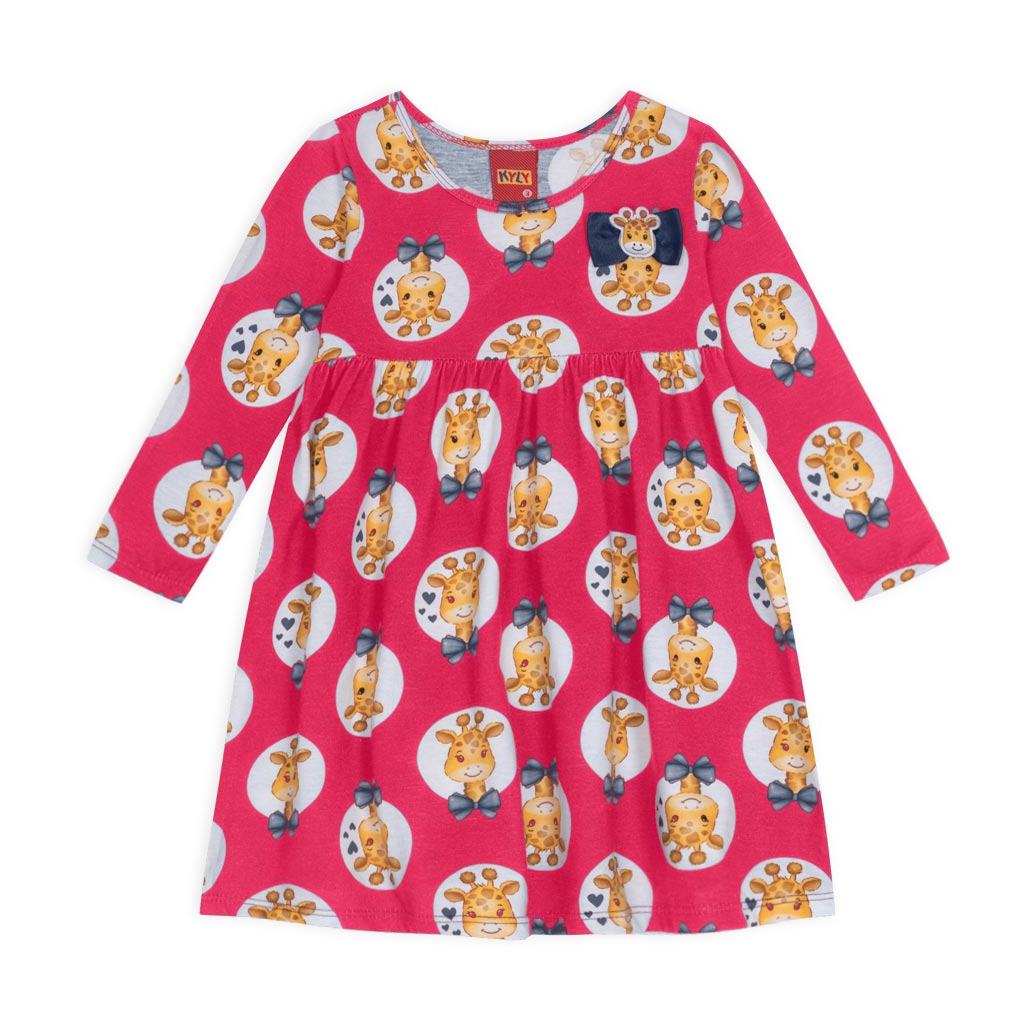 Krásne šaty s dlhým rukávom. Veselá potlač žirafiek a našitá mašlička. Okrúhly výstrih, nariasenie pod živôtikom. Príjemný bavlnený úplet. Vyrobené v Brazílii.Dodatočné parametre