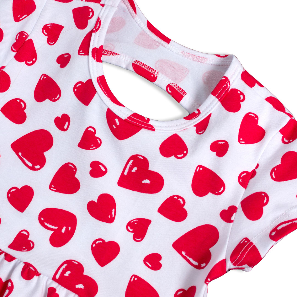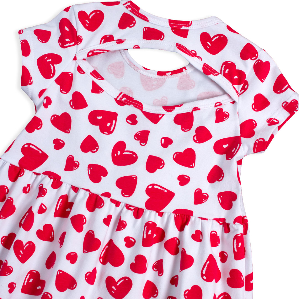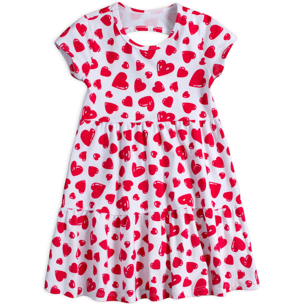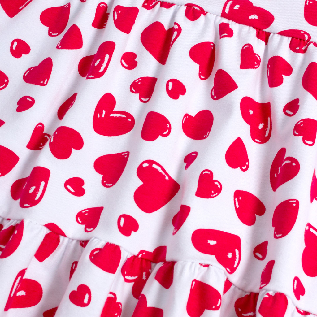Krásne šaty s potlačou srdiečok. Krátky rukáv, široká sukňa. Prestrih na chrbte. Veľmi príjemný materiál, mäkký a pružný. Vyrobené v Brazílii.Dodatočné parametre