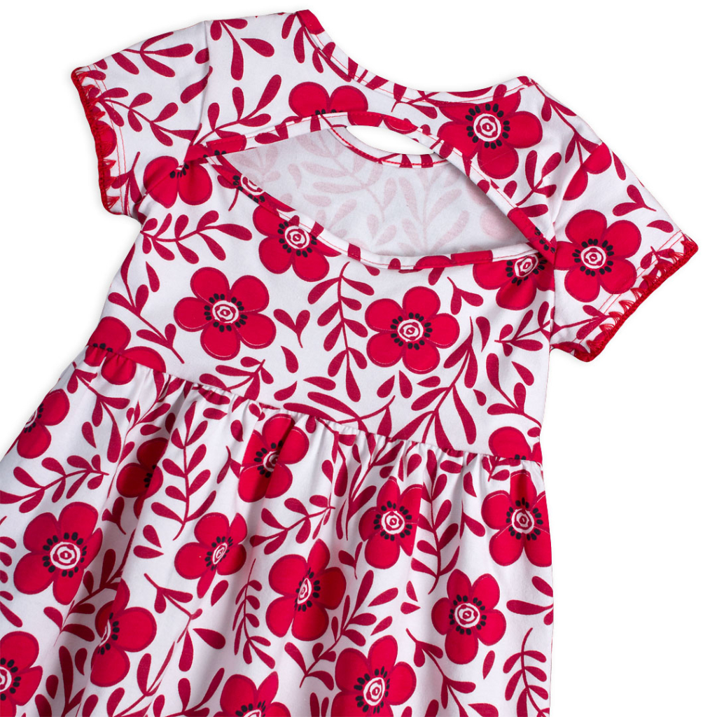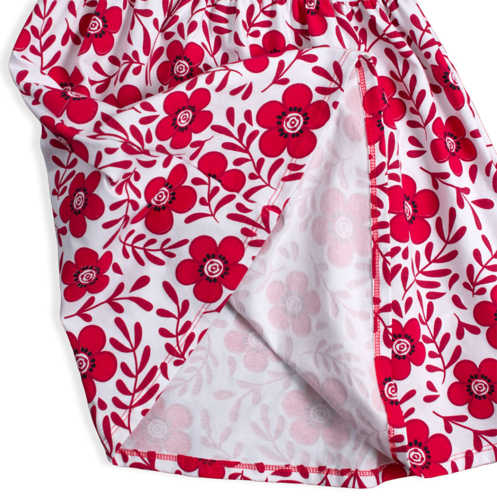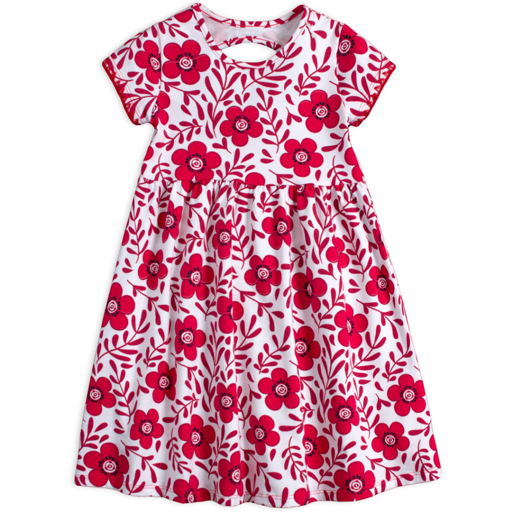 Dievčenské šaty s krásnou potlačou červených kvetov. Krátky rukáv, vzadu prestrih. Veľmi príjemný, pružný materiál. Vyrobené v Brazílii.