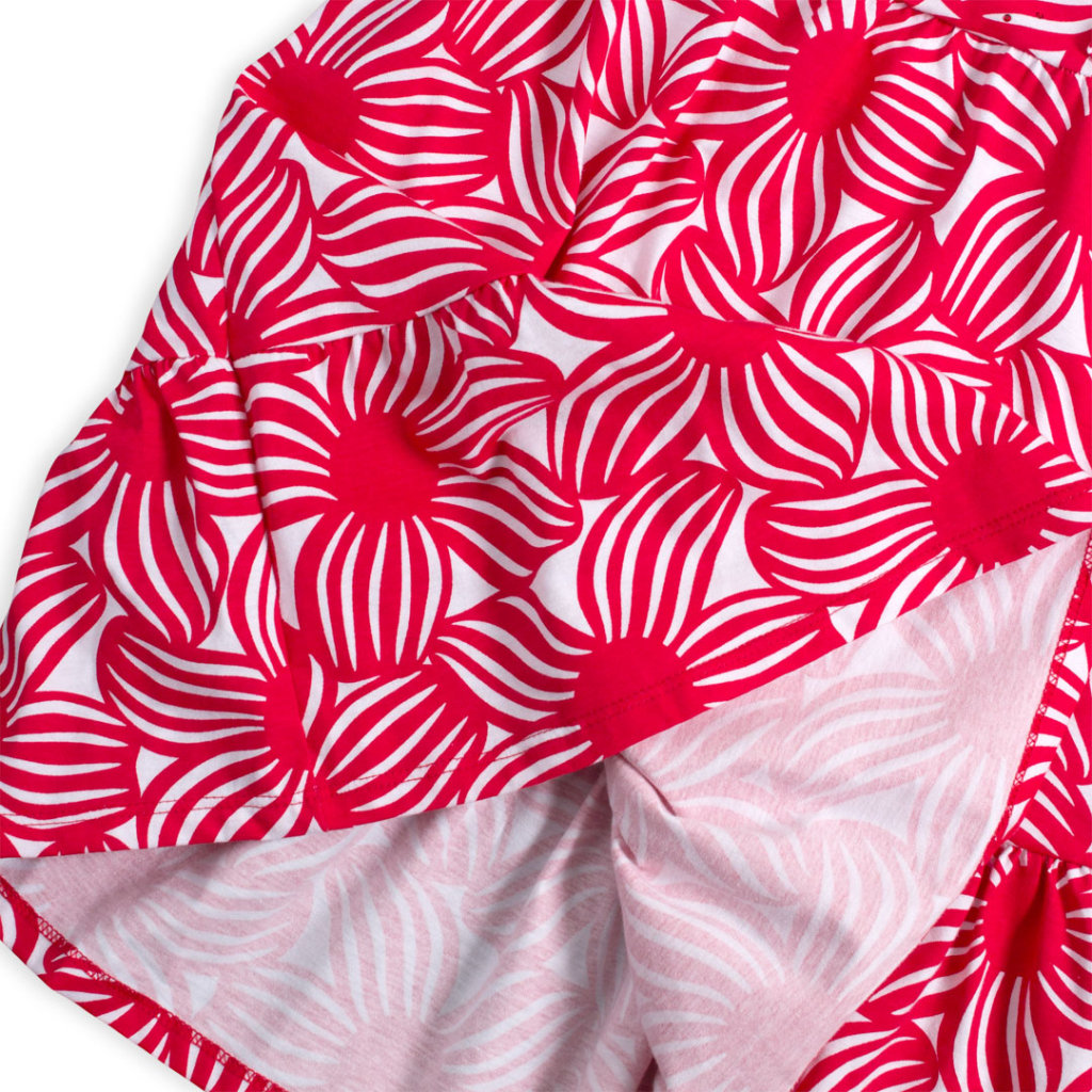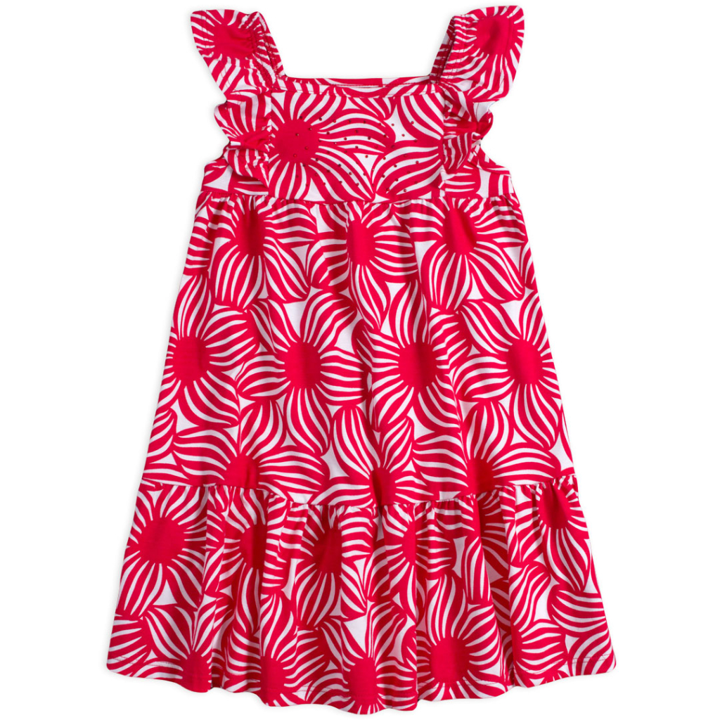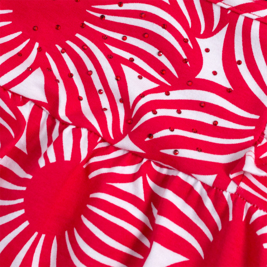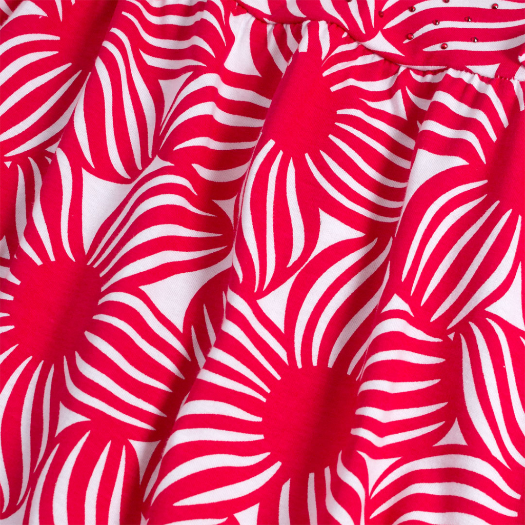 Dievčenské letné šaty. Bez rukávov, pohodlný, rozšírený strih, dole volán. Živôtik ozdobený drobnými kamienkami. Mäkký bavlnený úplet. Vyrobené v Brazílii.Dodatočné parametre
