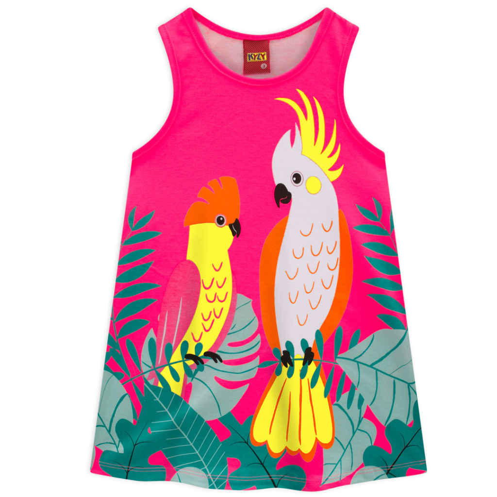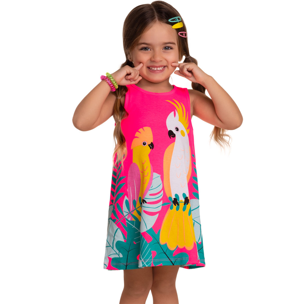 Dievčenské letné šaty bez rukávov. Farebná potlač na neónovo ružovom podklade. Bavlnený úplet. Vyrobené v Brazílii.Dodatočné parametre