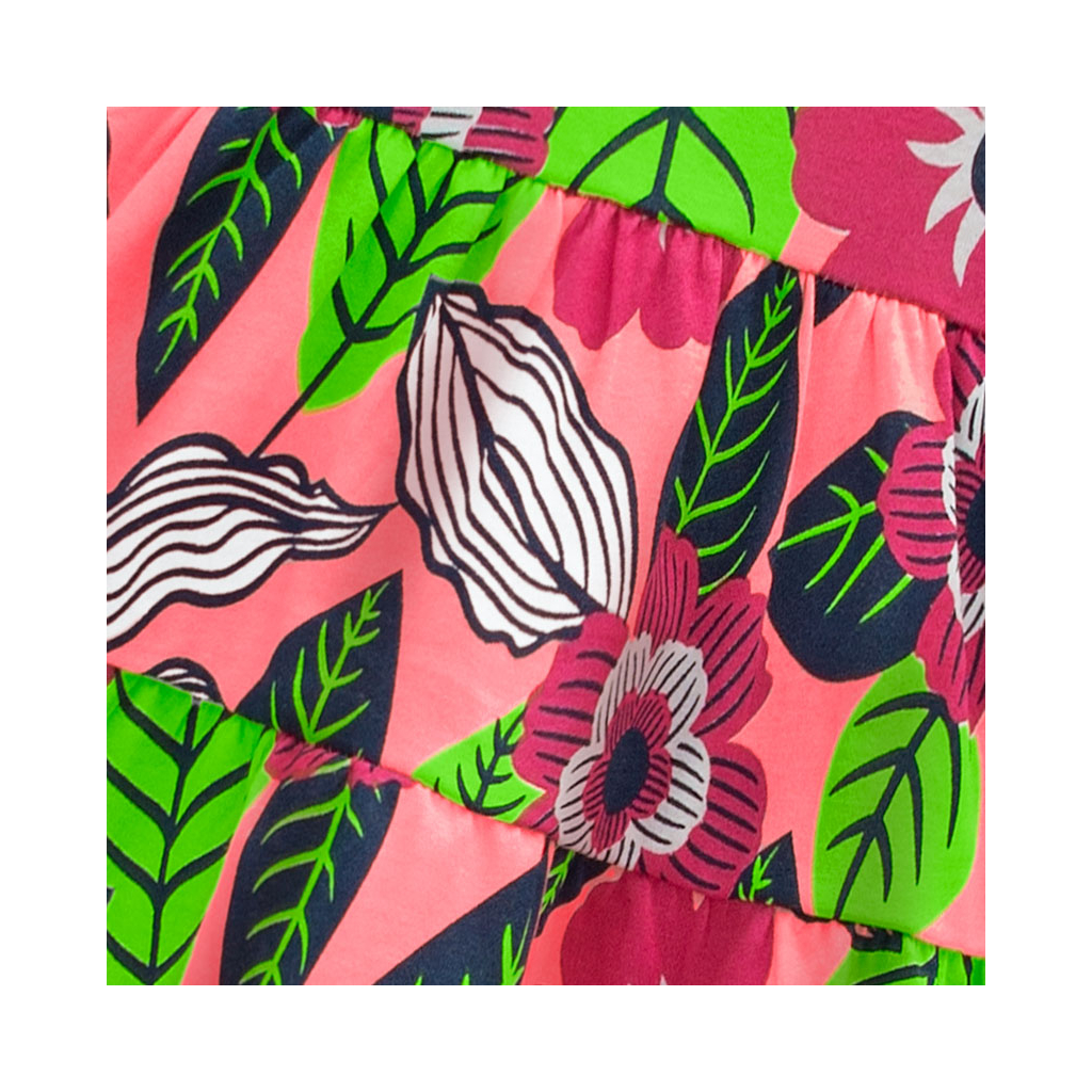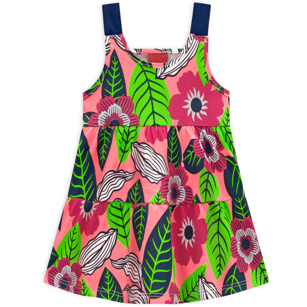 Dievčenské letné šaty bez rukávov. Pohodlný, rozšírený strih. Pružný bavlnený úplet s potlačou. Vyrobené v Brazílii.Dodatočné parametre