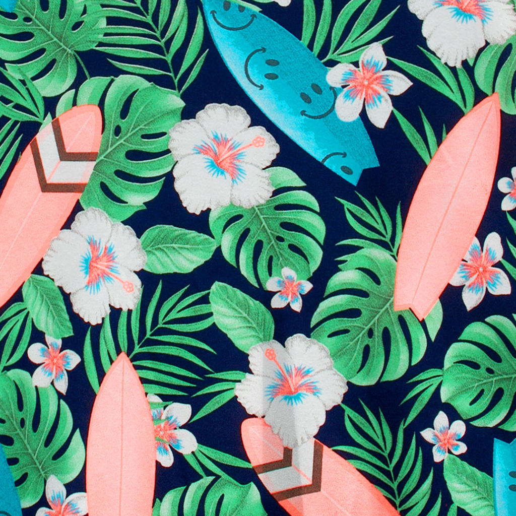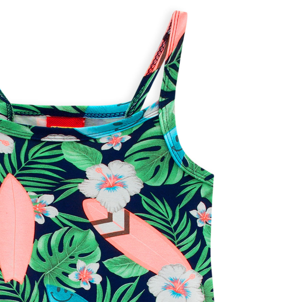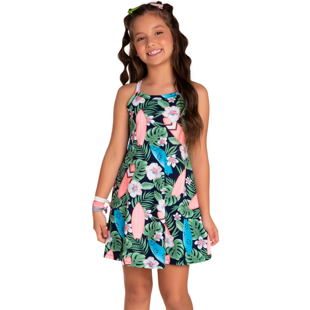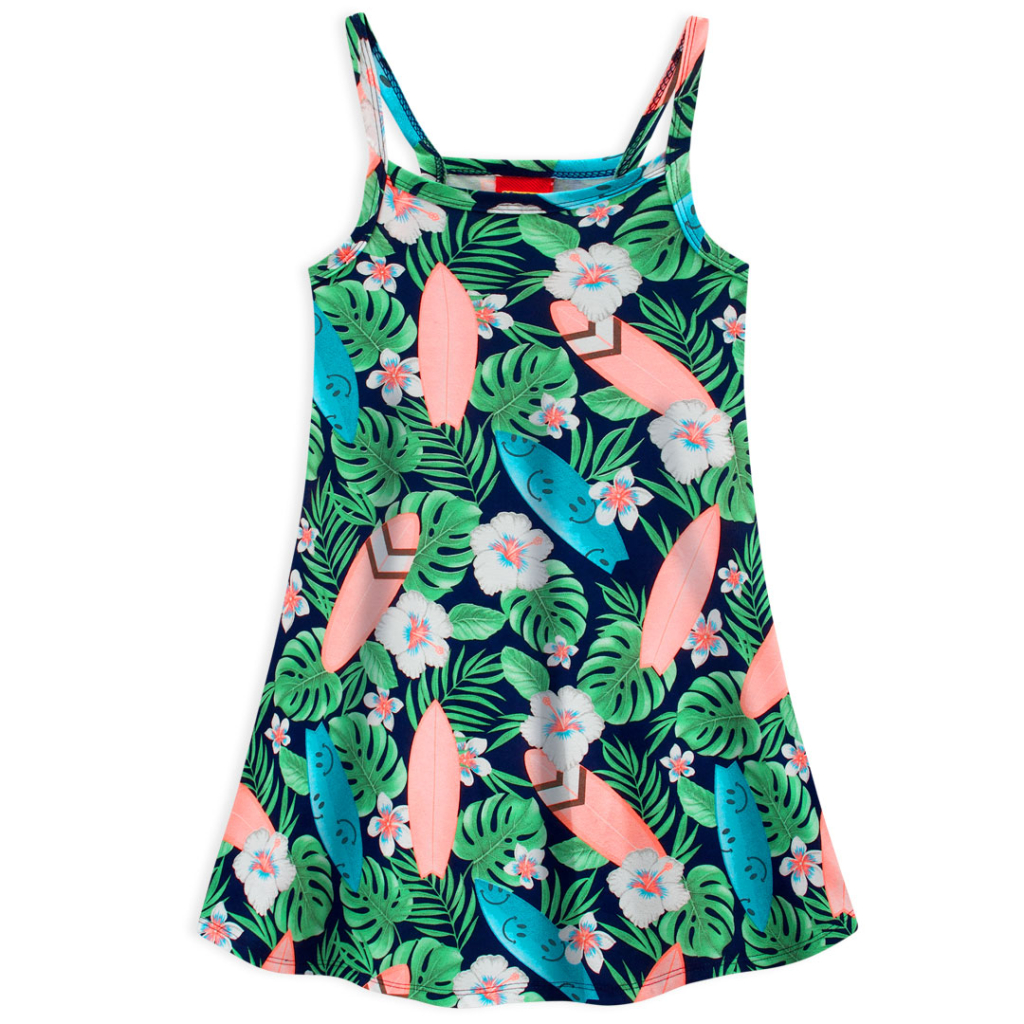 Dievčenské letné šaty bez rukávov, s úzkymi ramienkami. Pohodlný, rozšírený strih. Pružný, mäkký úplet s potlačou. Vyrobené v Brazílii.Dodatočné parametre