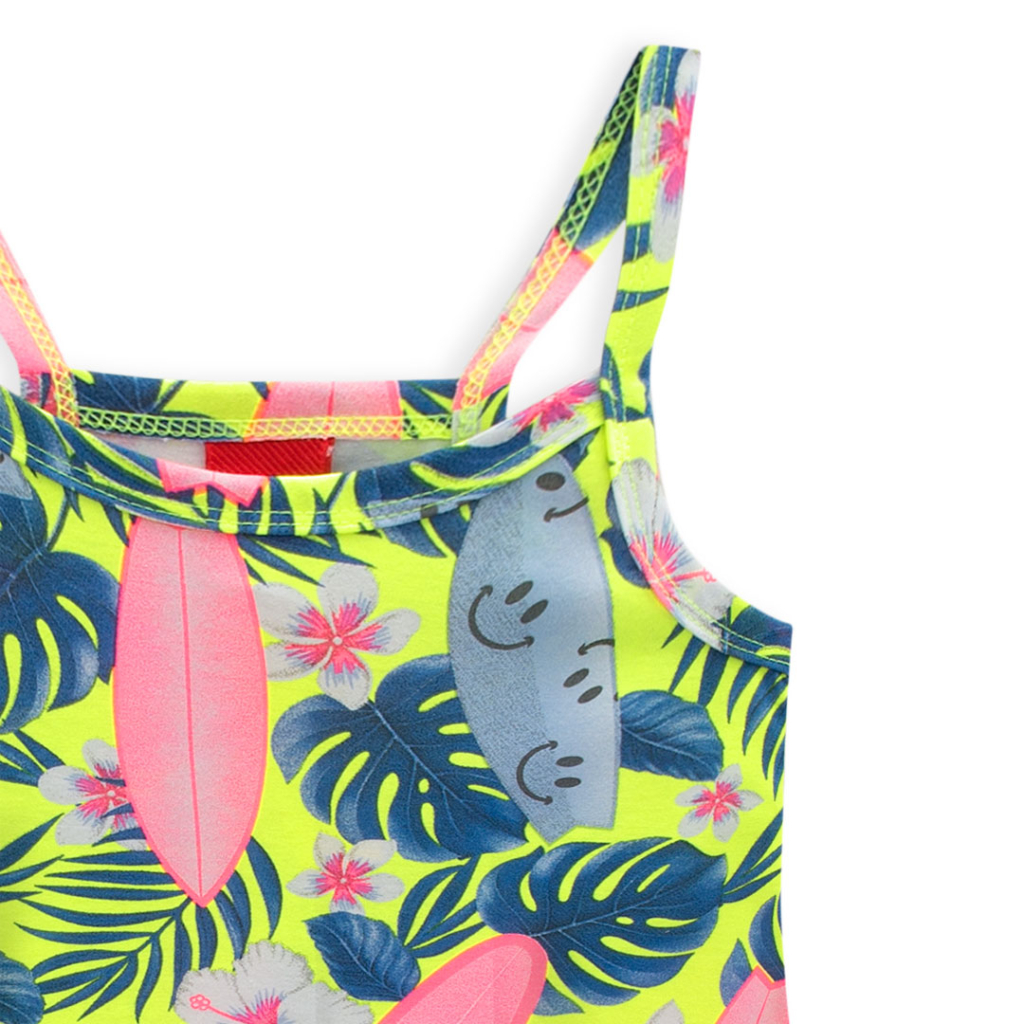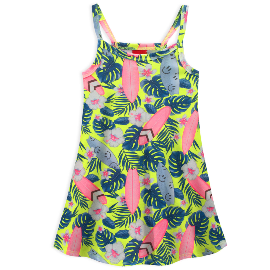Dievčenské letné šaty bez rukávov, s úzkymi ramienkami. Pohodlný, rozšírený strih. Pružný, mäkký úplet s potlačou. Vyrobené v Brazílii.Dodatočné parametre