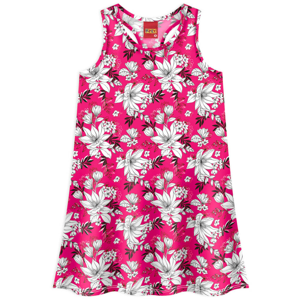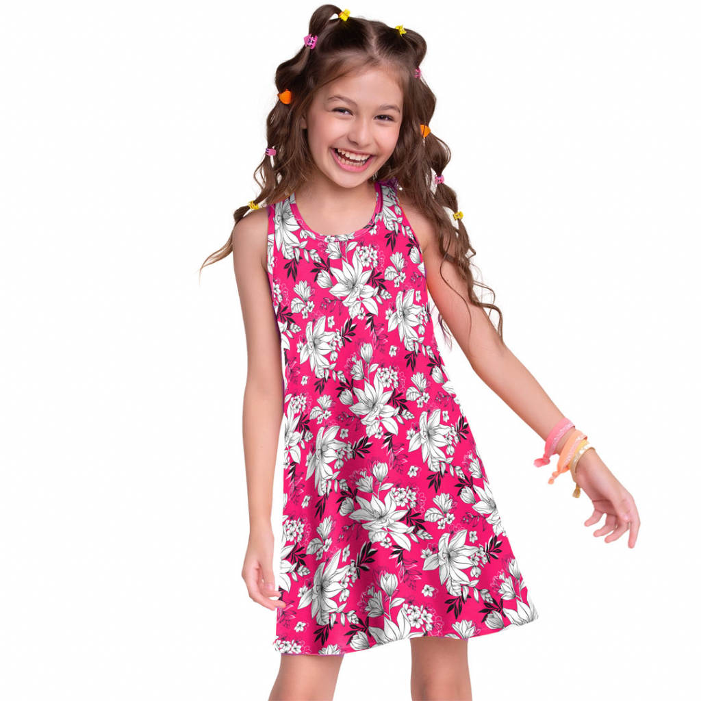 Dievčenské letné šaty bez rukávov. Prieramky vzadu vykrojené. Rozšírený strih. Bavlnený úplet s potlačou veľkých kvetov. Vyrobené v Brazílii.Dodatočné parametre