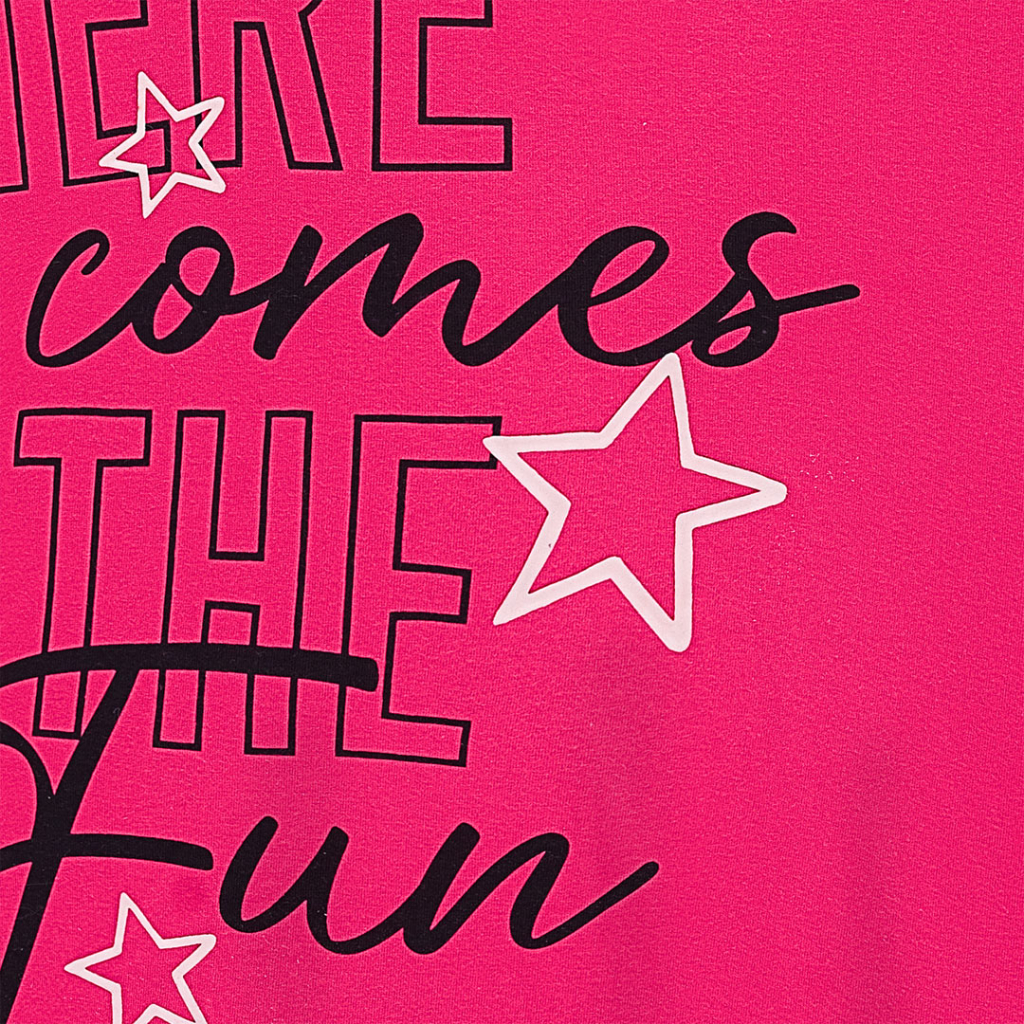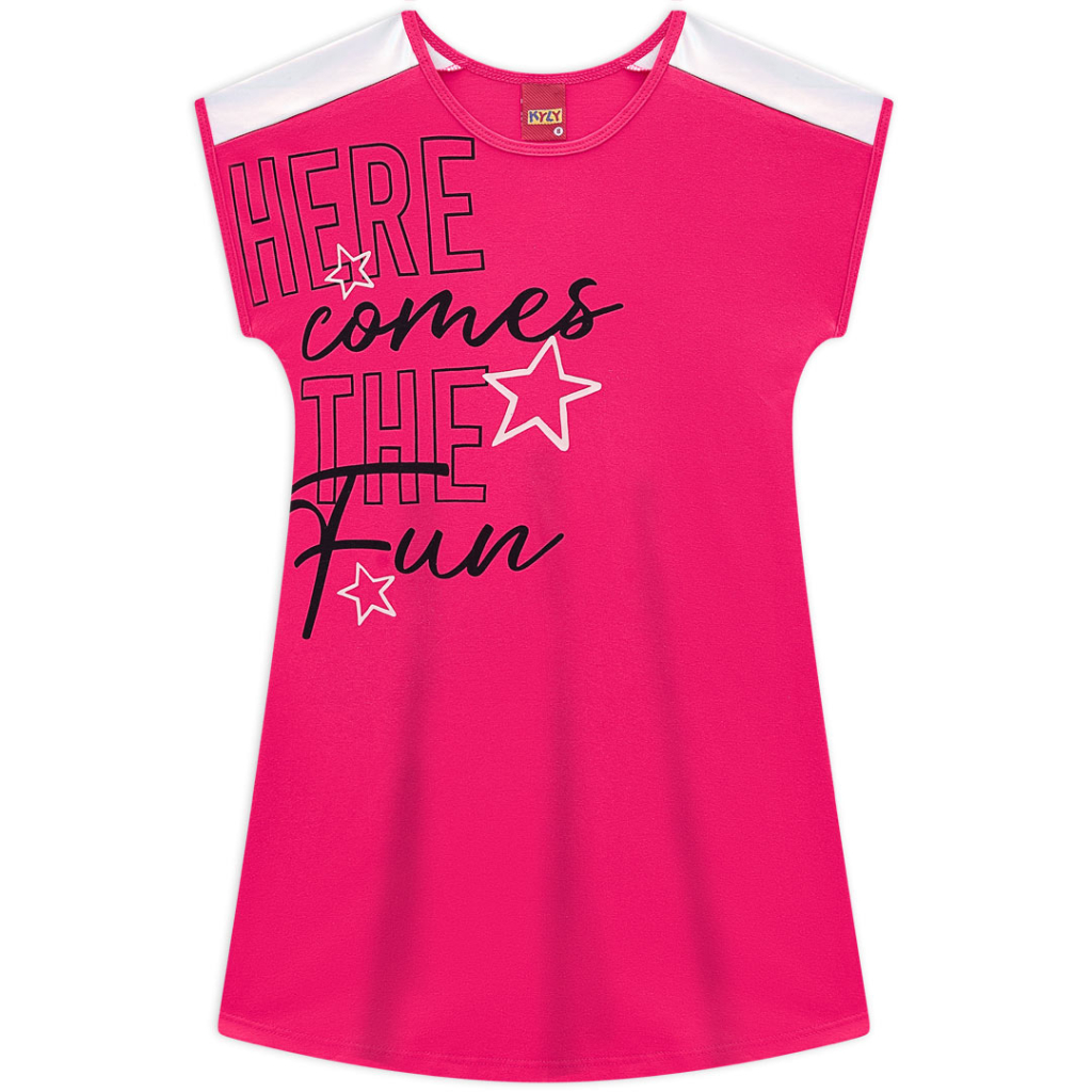 Dievčenské šaty s krátkym, spadnutým rukávikom. Vpredu potlač, na ramenách lesklá vsadka. Príjemný, pružný materiál. Vyrobené v Brazílii.Dodatočné parametre