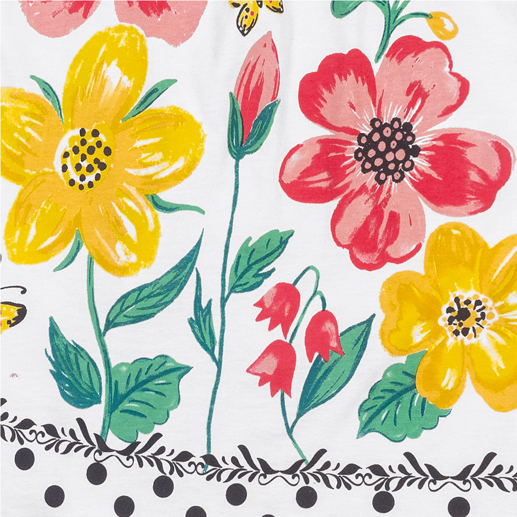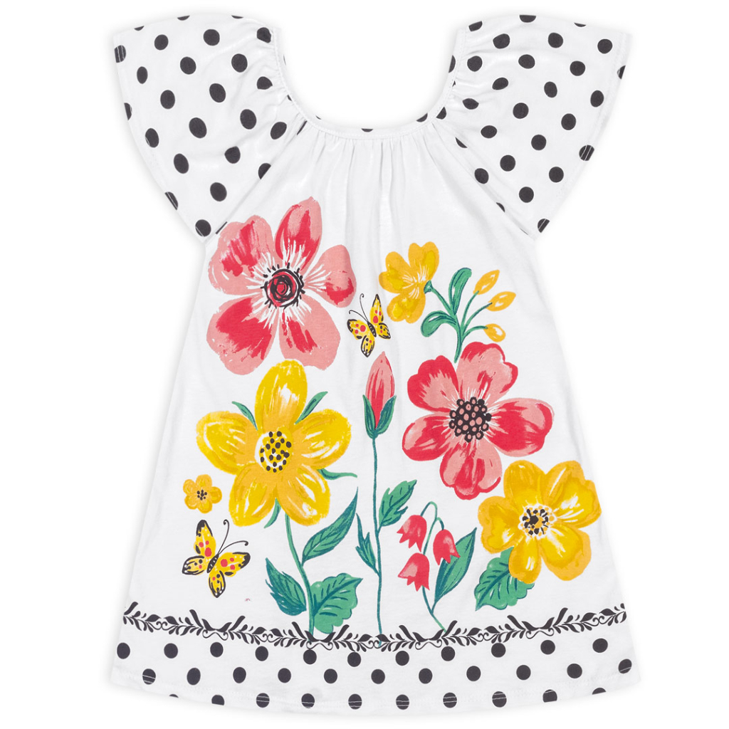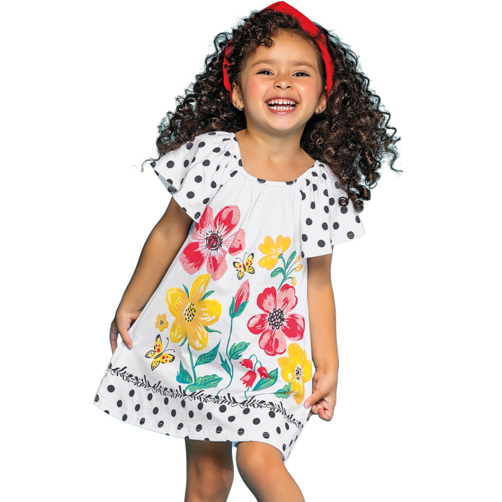 Dievčenské letné šaty s krátkym, volánikovým rukávikom. Farebná potlač na bavlnenom úplete. Vyrobené v Brazílii.Dodatočné parametre