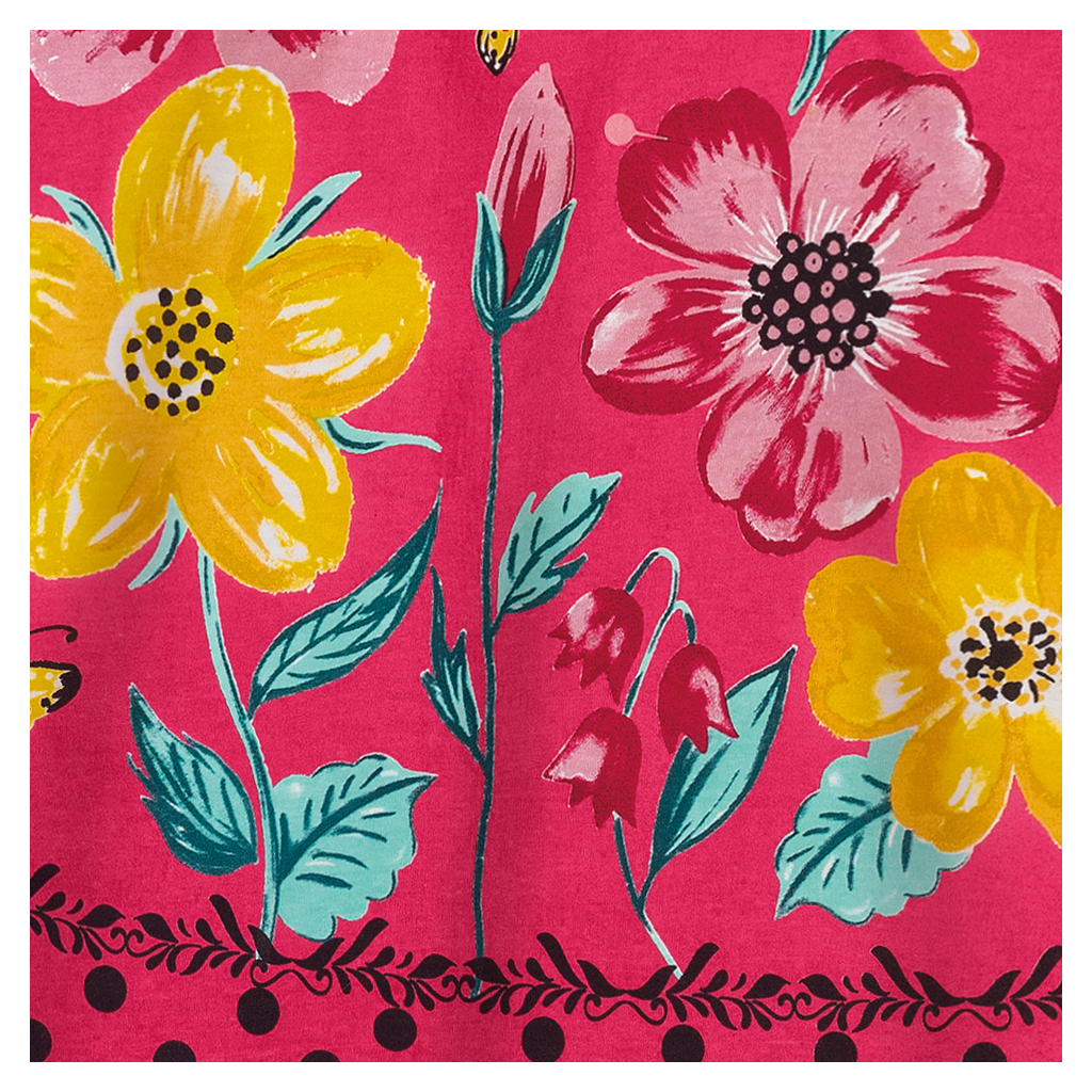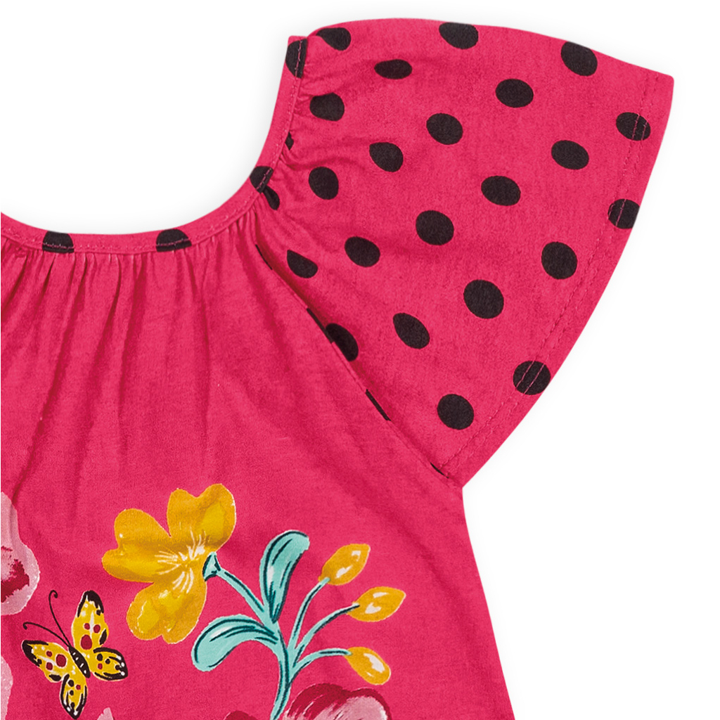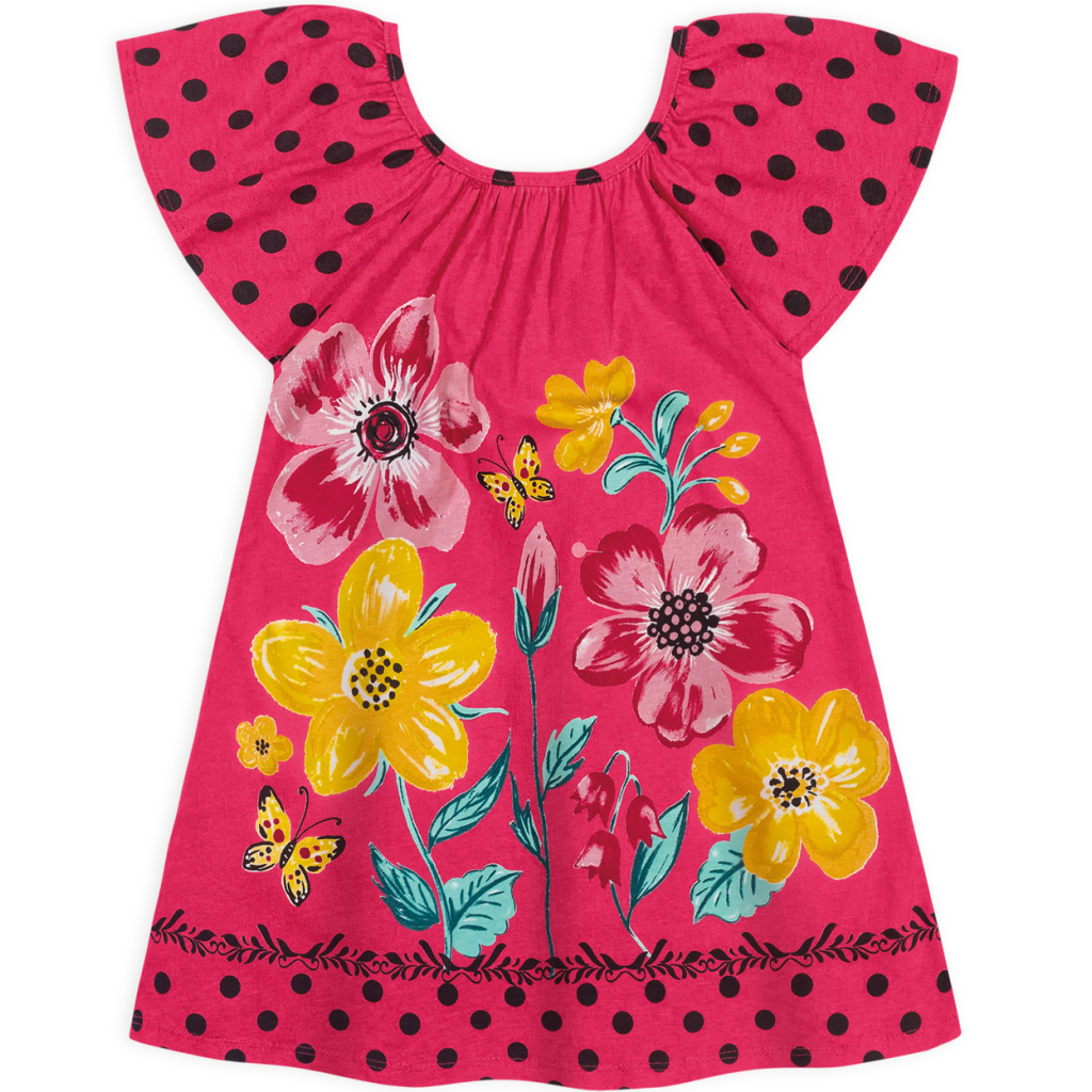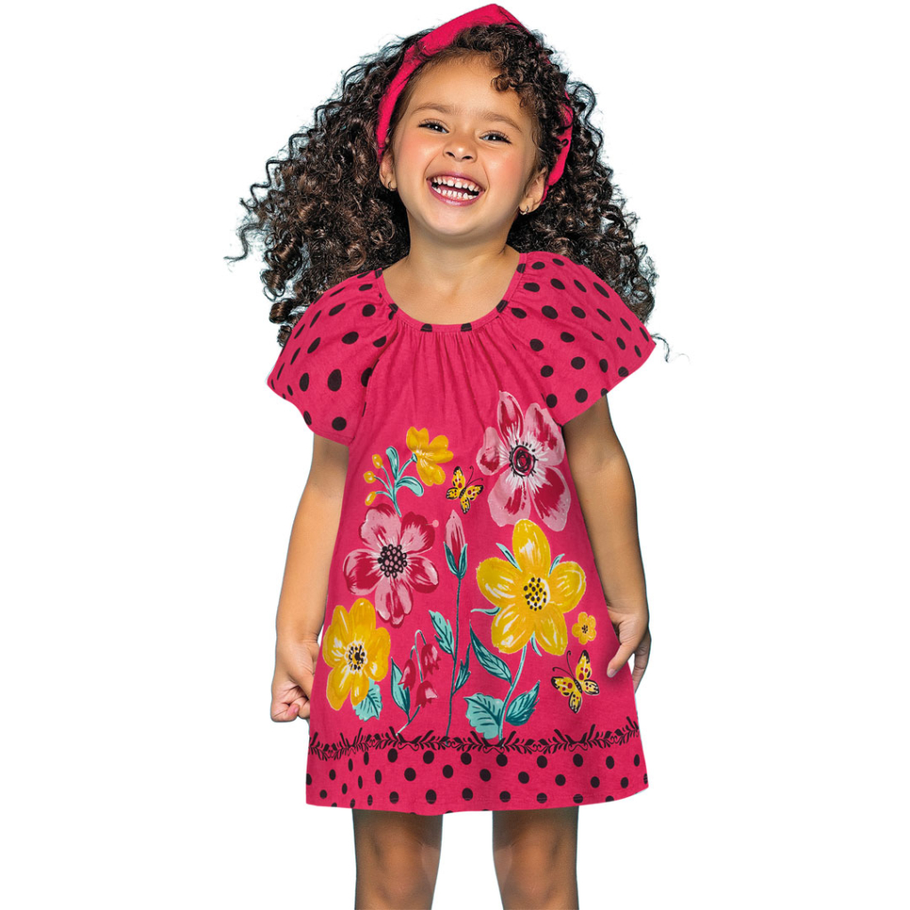 Dievčenské letné šaty s krátkym, volánikovým rukávikom. Farebná potlač na bavlnenom úplete. Vyrobené v Brazílii.Dodatočné parametre