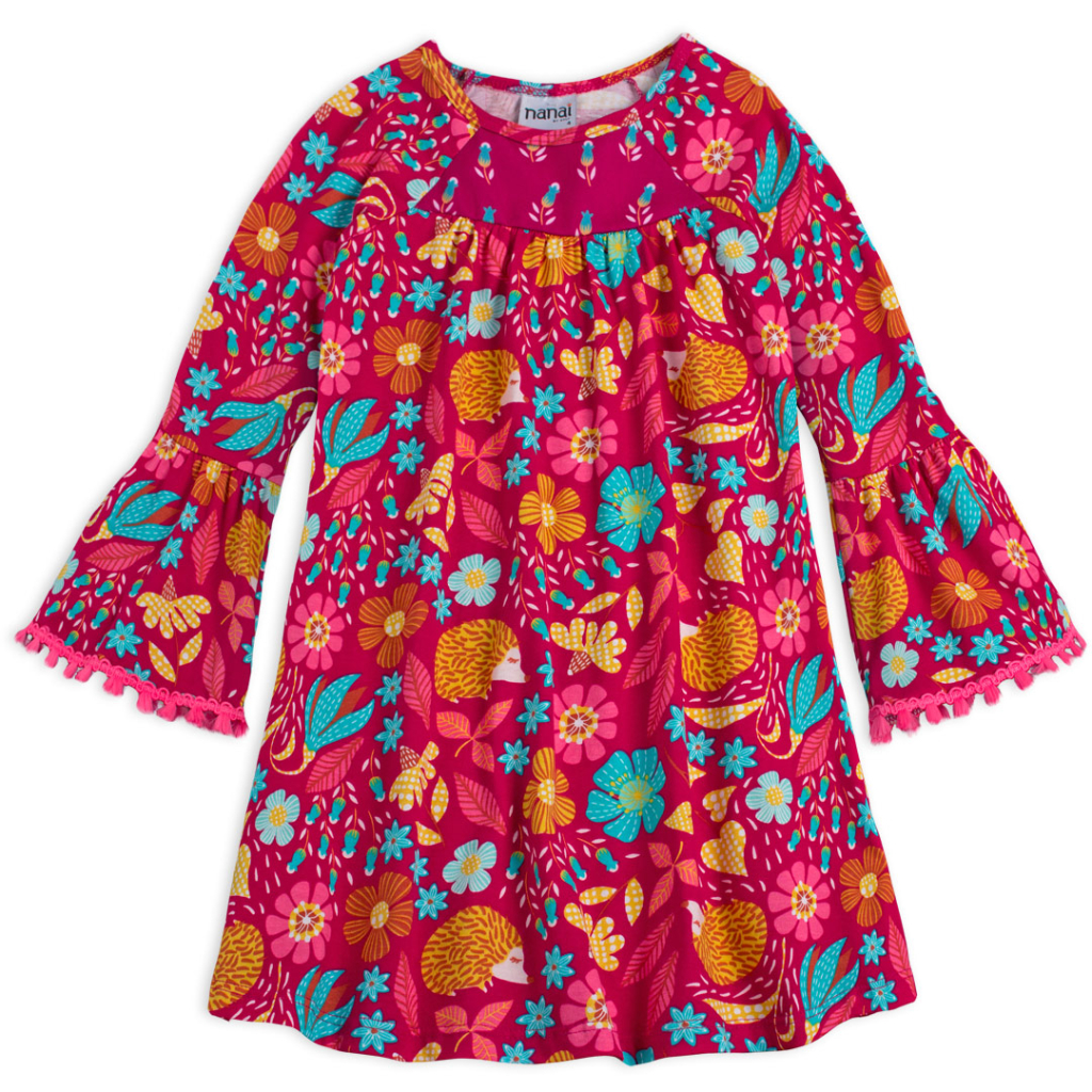 Bavlnené dievčenské šaty s dlhým rukávom. Rozšírený strih, vpredu nazberané. Na rukávoch našitý volán so strapcami. Príjemný úplet s výraznou farebnou potlačou.