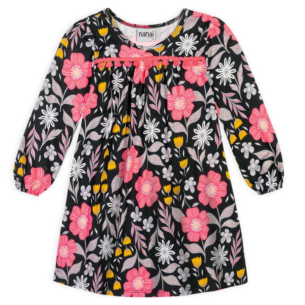 Krásne dievčenské šaty s dlhým rukávom. Rozšírený strih, rukávy do gumičky. Bavlnený úplet s výraznou kvetinovou potlačou. Vyrobené v Brazílii.