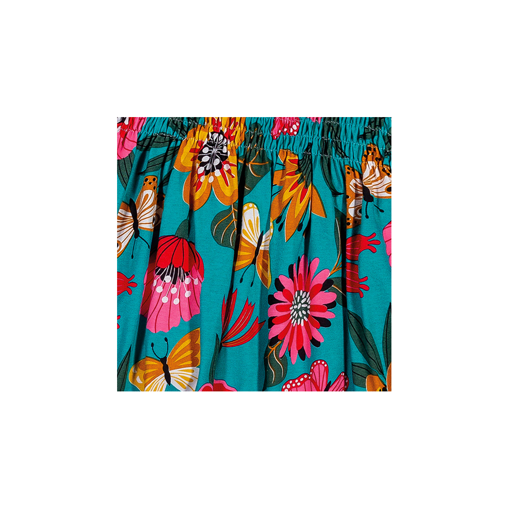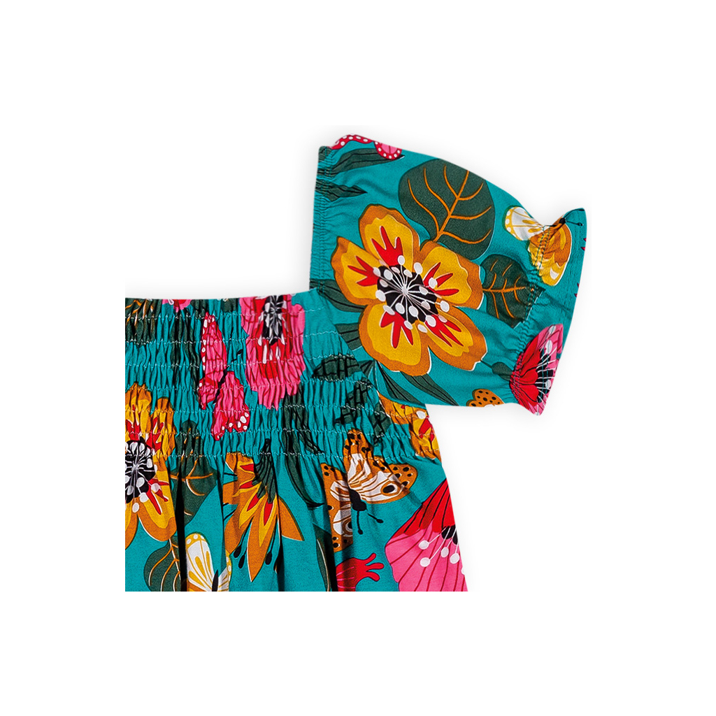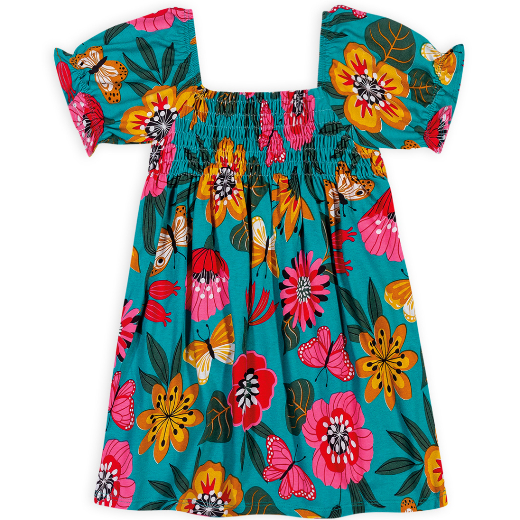 Dievčenské letné šaty s krátkym rukávom. Živôtik nariasený žabičkováním. Rozšírený strih. Veľmi pohodlný, pružný úplet. Vyrobené v Brazílii.Dodatočné parametre
