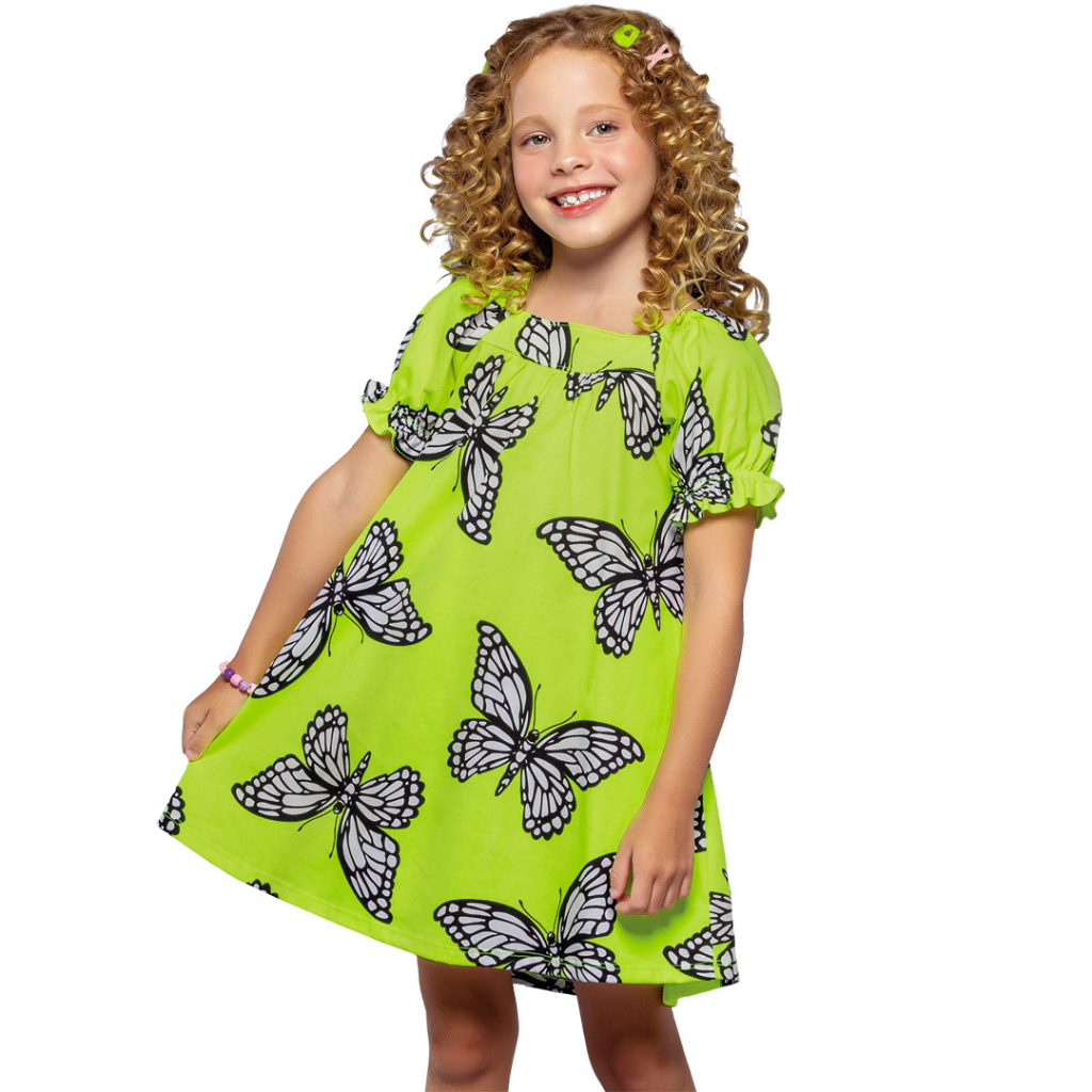 Dievčenské letné šaty. Krátky rukávik s jemnou gumičkou. Voľný, rozšírený strih. Okolo ramien a v zadnej časti výstrihu gumička. Veľká potlač. Vzdušný bavlnený úplet. Vyrobené v Brazílii.Dodatočné parametre
