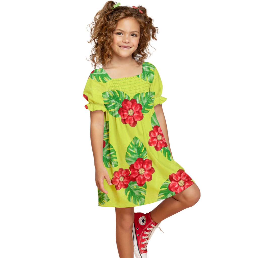 Úžasné letné šaty s krátkym rukávom. Rozšírený strih, živôtik so žabičkovaním. Mäkký, pružný, bavlnený úplet s krásne farebnou potlačou. Vyrobené v Brazílii.Dodatočné parametre