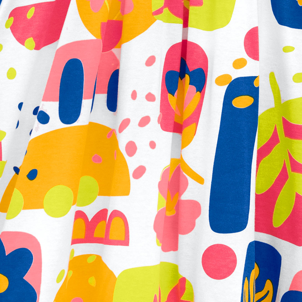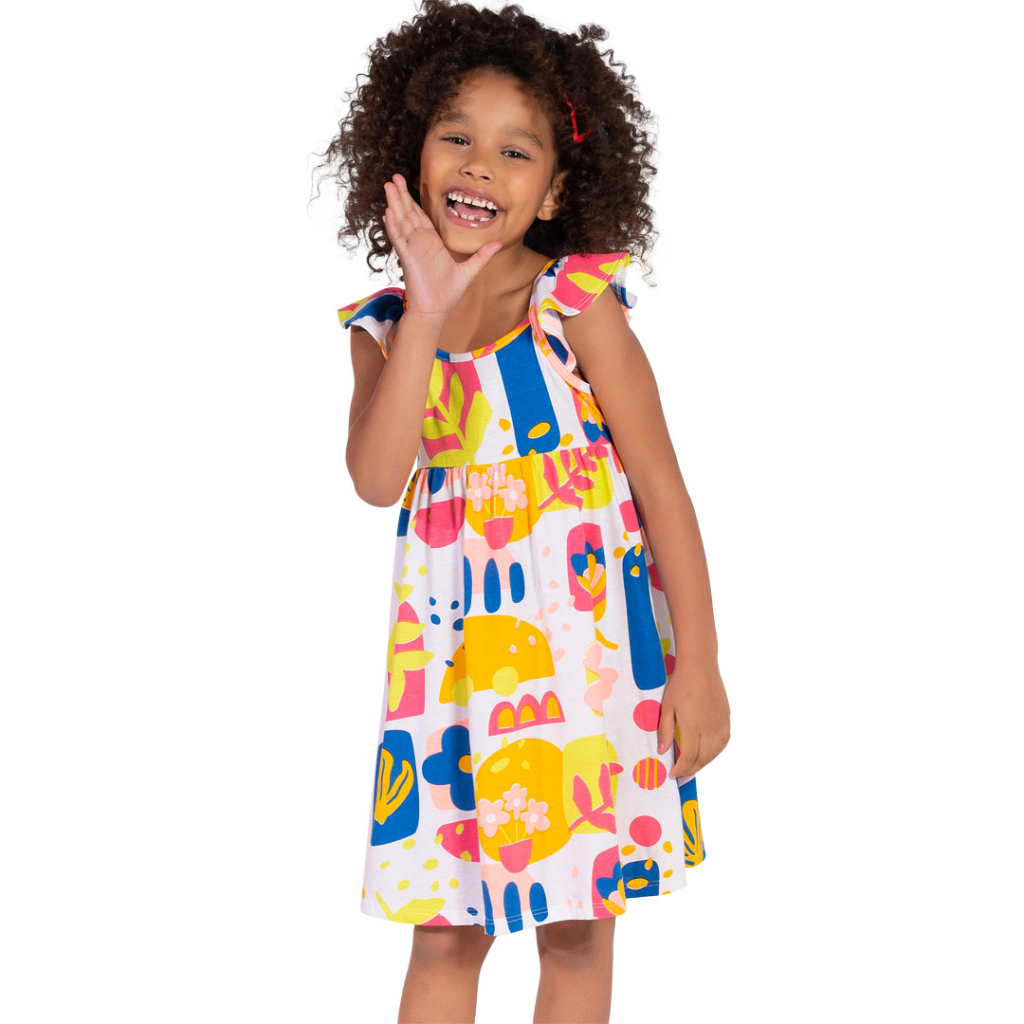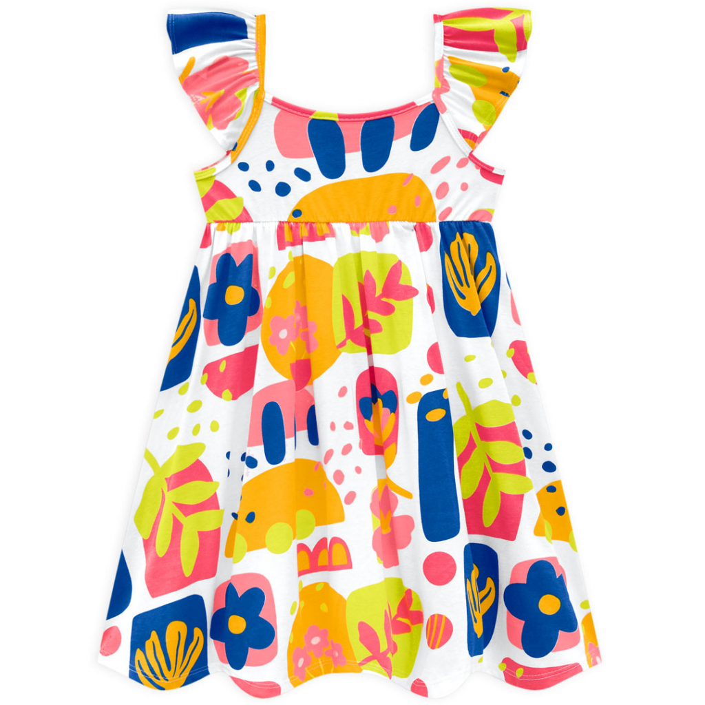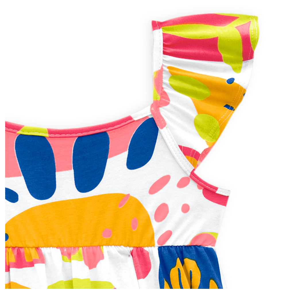 Dievčenské letné šaty. Bez klasických rukávov, s volánikom na ramienkach. Nazberaná sukňa. Veselá, farebná potlač. Vzdušný bavlnený úplet. Vyrobené v Brazílii.Dodatočné parametre