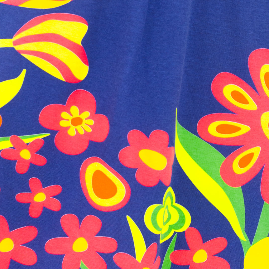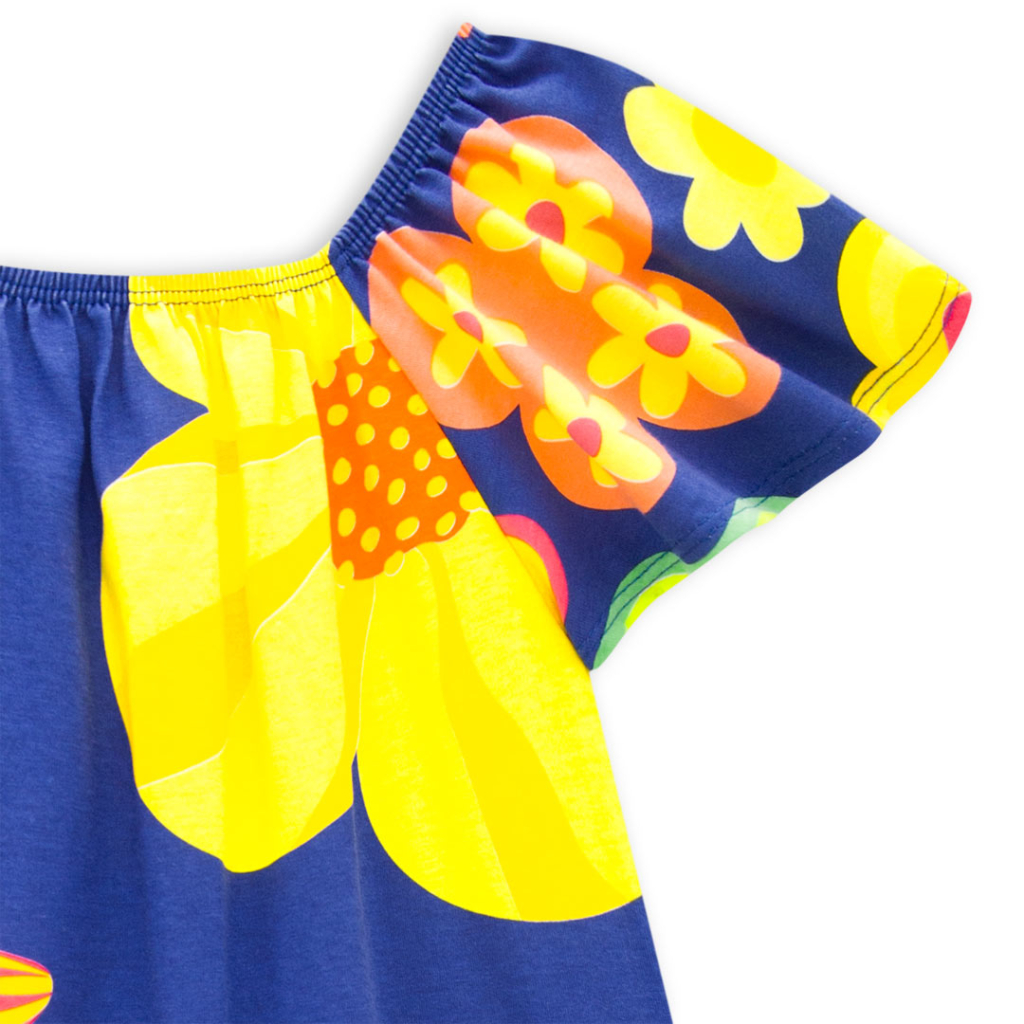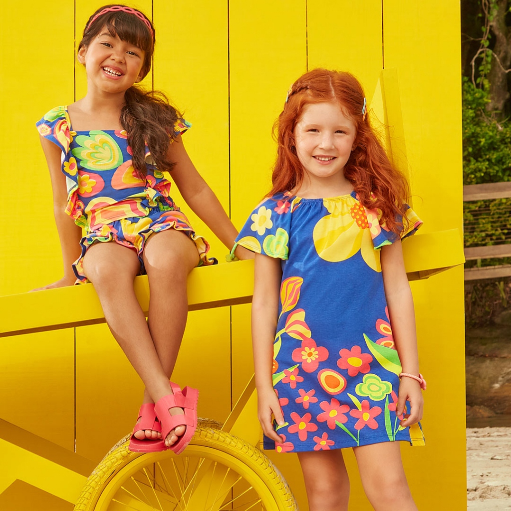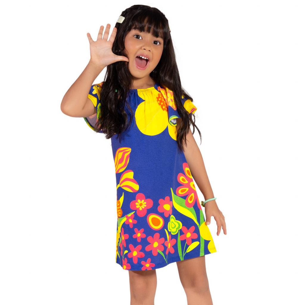 Letné šaty s krátkym motýlikovým rukávom. Gumička okolo výstrihu. Mierne rozšírený strih. Farebná potlač na bavlnenom úplete. Vyrobené v Brazílii.Dodatočné parametre