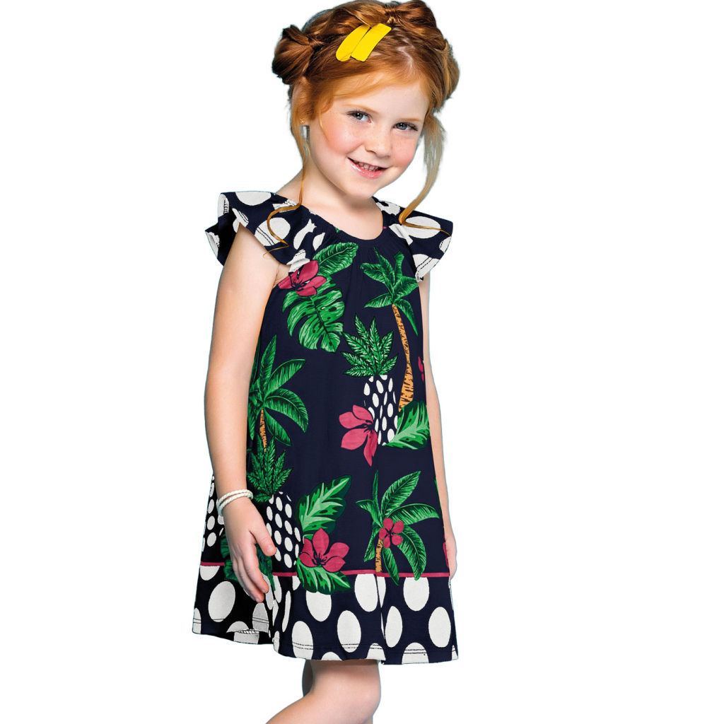 Krásne letné šaty. Farebná potlač. Voľný, pohodlný strih s volánikovým rukávikom. Okolo výstrihu gumička. Vyrobené v Brazílii.Dodatočné parametre