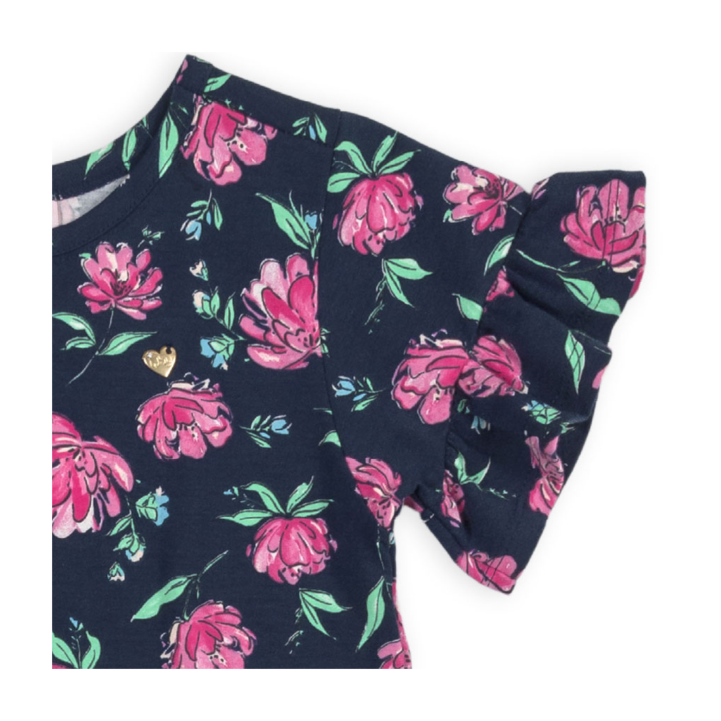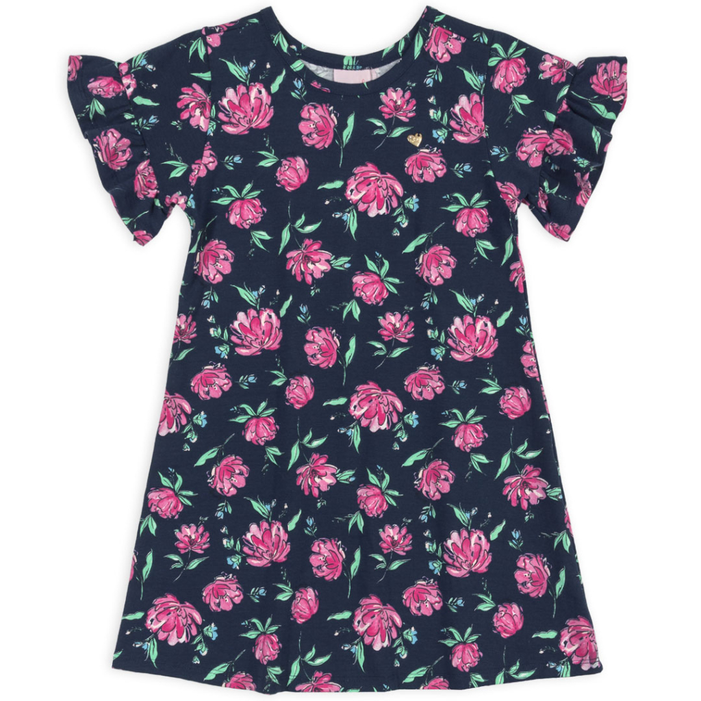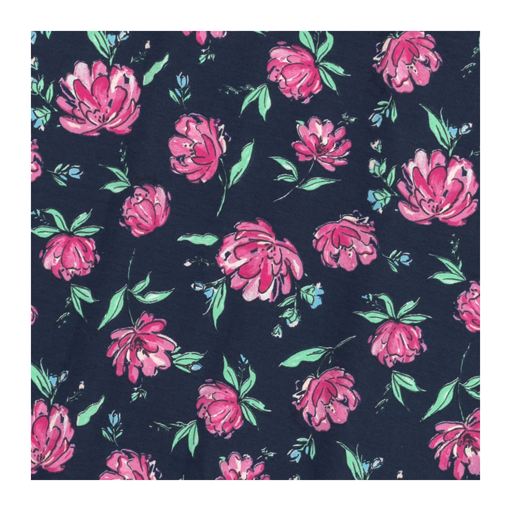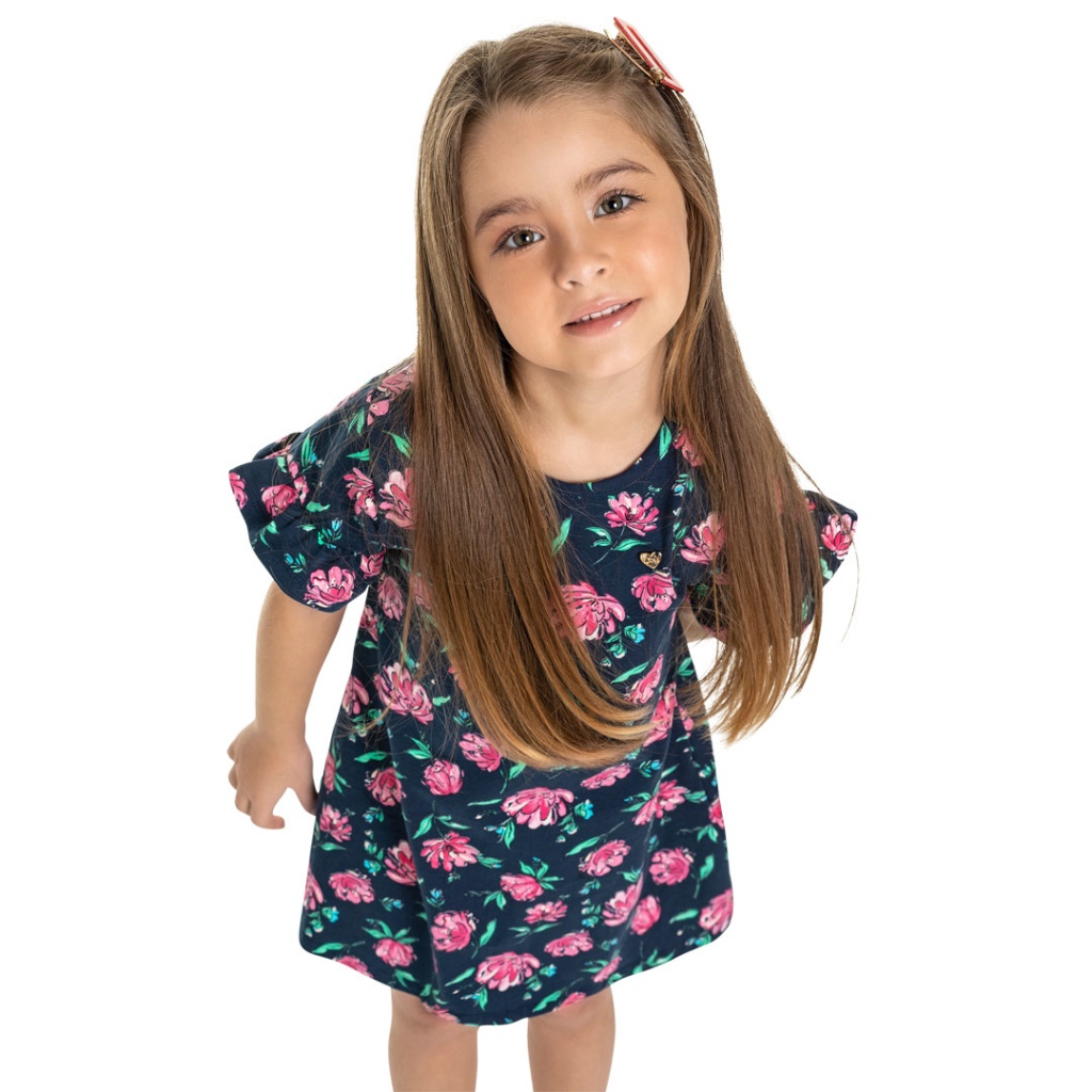 Krásne letné šaty s potlačou ružových kvetov na tmavo-modrom podklade. Krátky rukáv ukončený volánikom. Príjemný, dosť pružný materiál. Vyrobené v Brazílii.