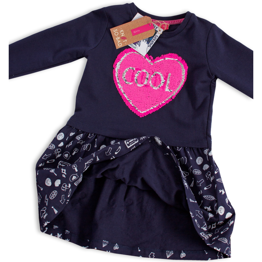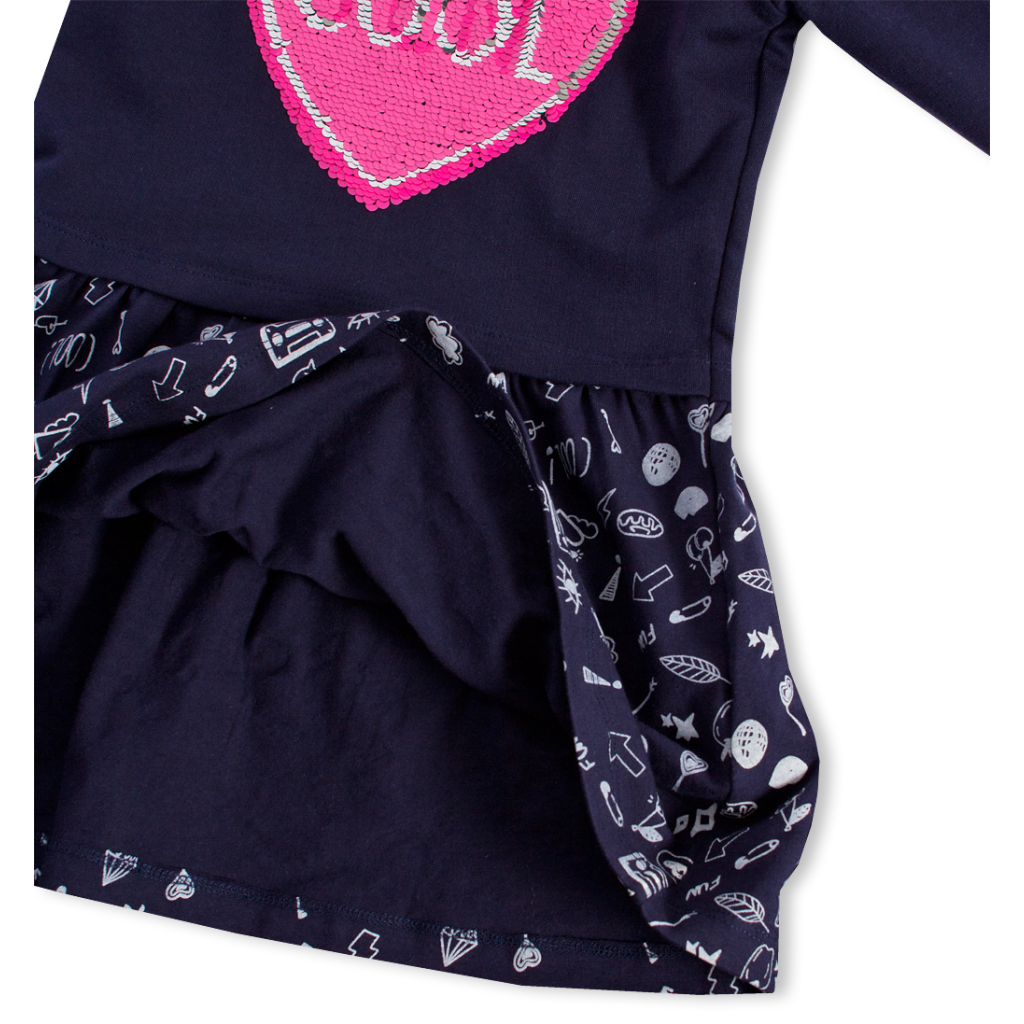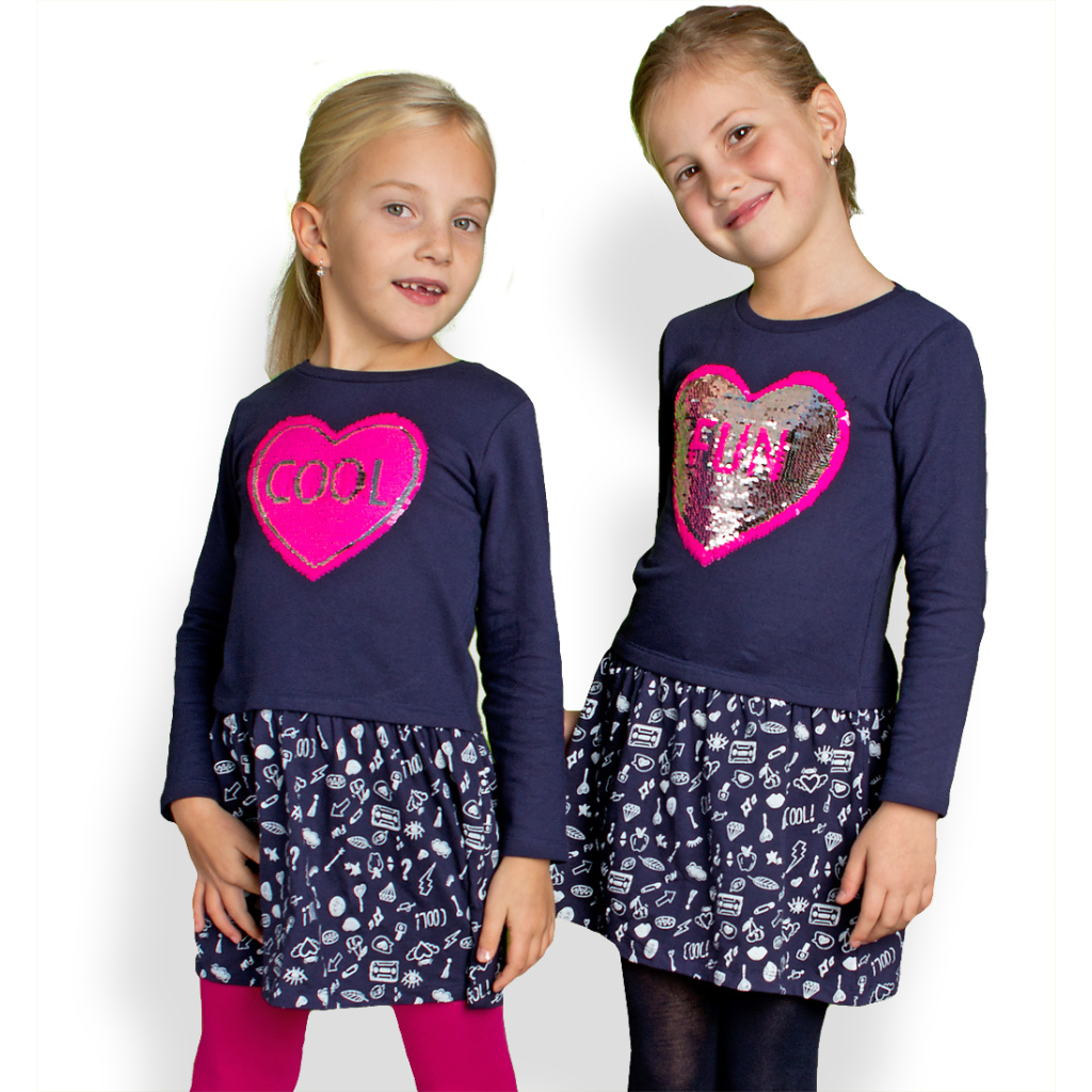 Dievčenské šaty s dlhým rukávom. Aplikácia z preklápacích flitrov. Spodná časť s potlačou. Príjemný bavlnený úplet.Dodatočné parametre