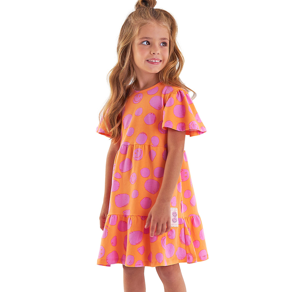 Dievčenské letné šaty s krátkym rukávom. Príjemný, pružný úplet s potlačou a malou nášivkou. Vzadu pri krku gombík. Pohodlný, voľnejší strih. Vyrobené v Brazílii.Dodatočné parametre