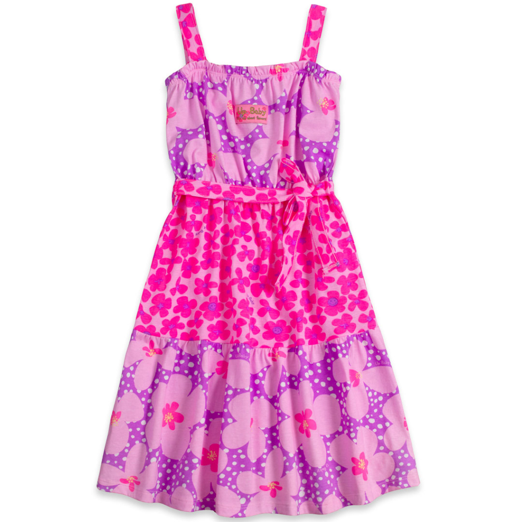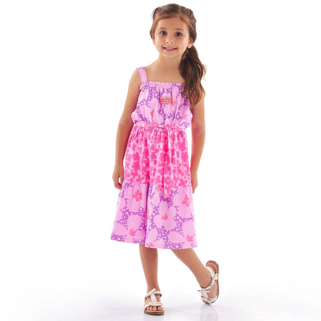 Dievčenské šaty bez rukávov. Nariasený živôtik s gumičkou. Široká sukňa s volánom. Na bokoch všitý opasok. Potlač kombinuje väčšie a menšie kvetinky a výrazné farby. Ľahký bavlnený úplet. Vyrobené v Brazílii.Dodatočné parametre