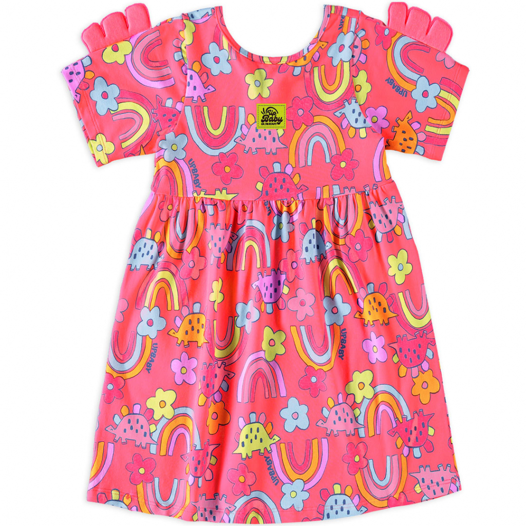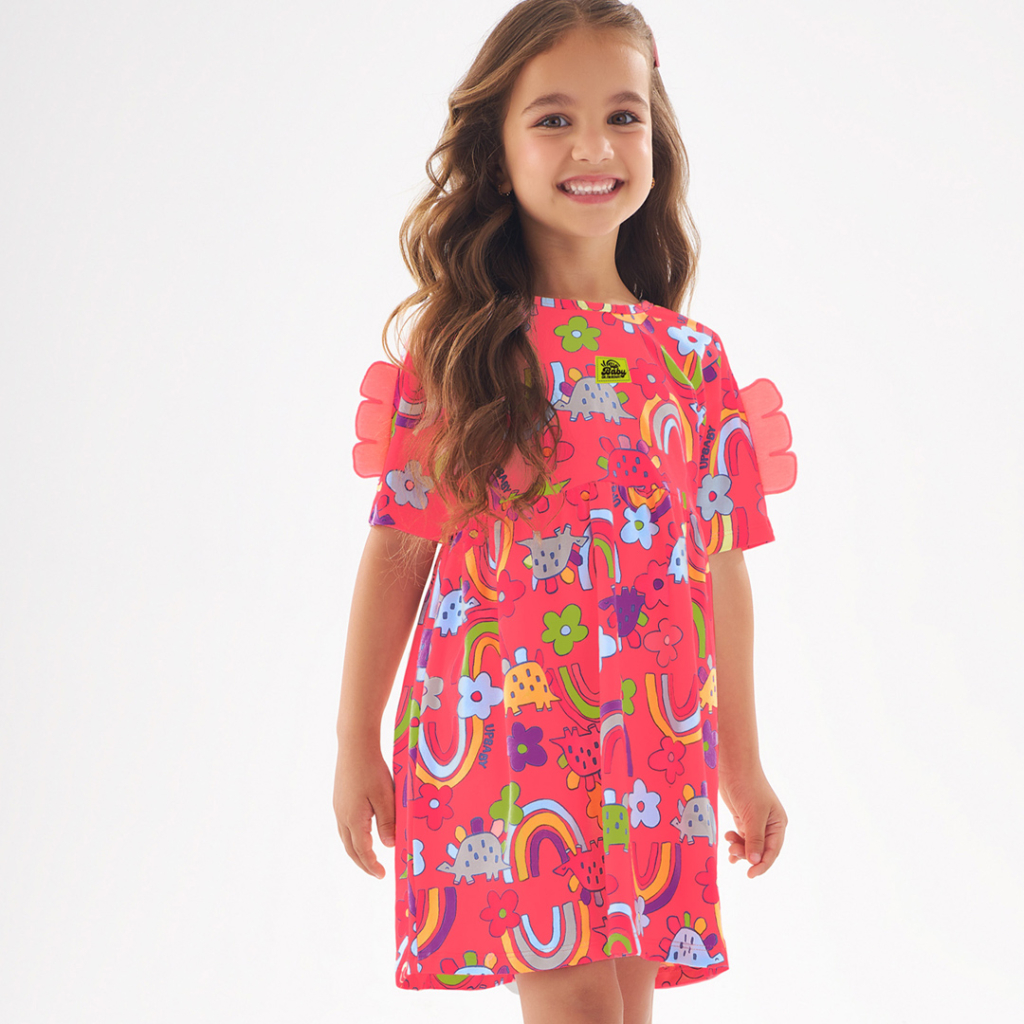 Dievčenské šaty s krátkym rukávom. Pružný bavlnený úplet s potlačou, žiarivé farby. Vpredu okrúhly výstrih, vzadu do V. Na rukávoch našitá aplikácia. Vyrobené v Brazílii.Dodatočné parametre