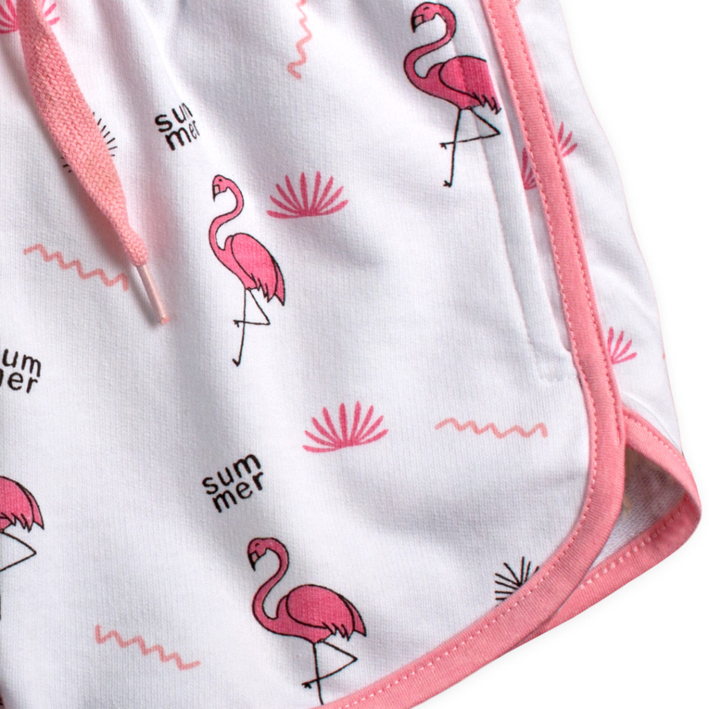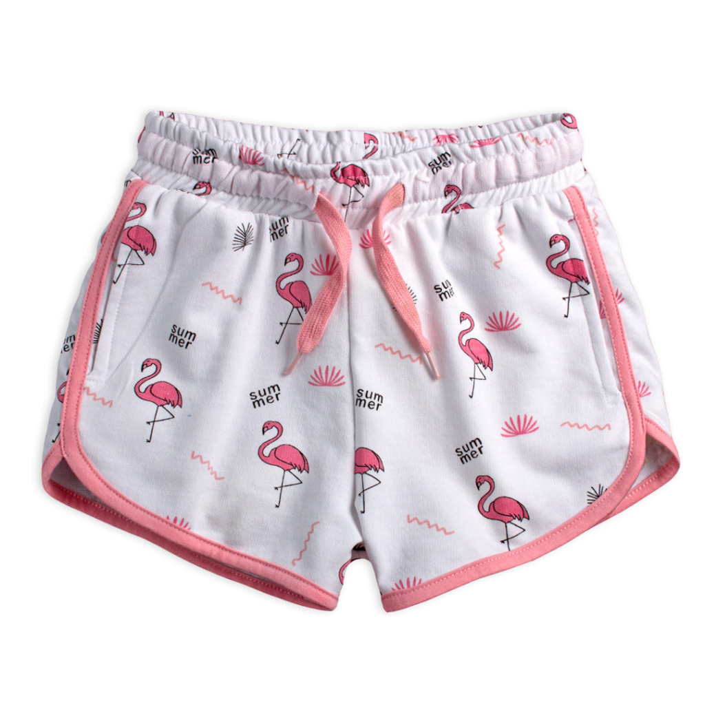 Dievčenské šortky z pohodlného úpletu, s potlačou ružových plameniakov. Funkčné vrecká. V páse guma, šnúrka na stiahnutie.Dodatočné parametre