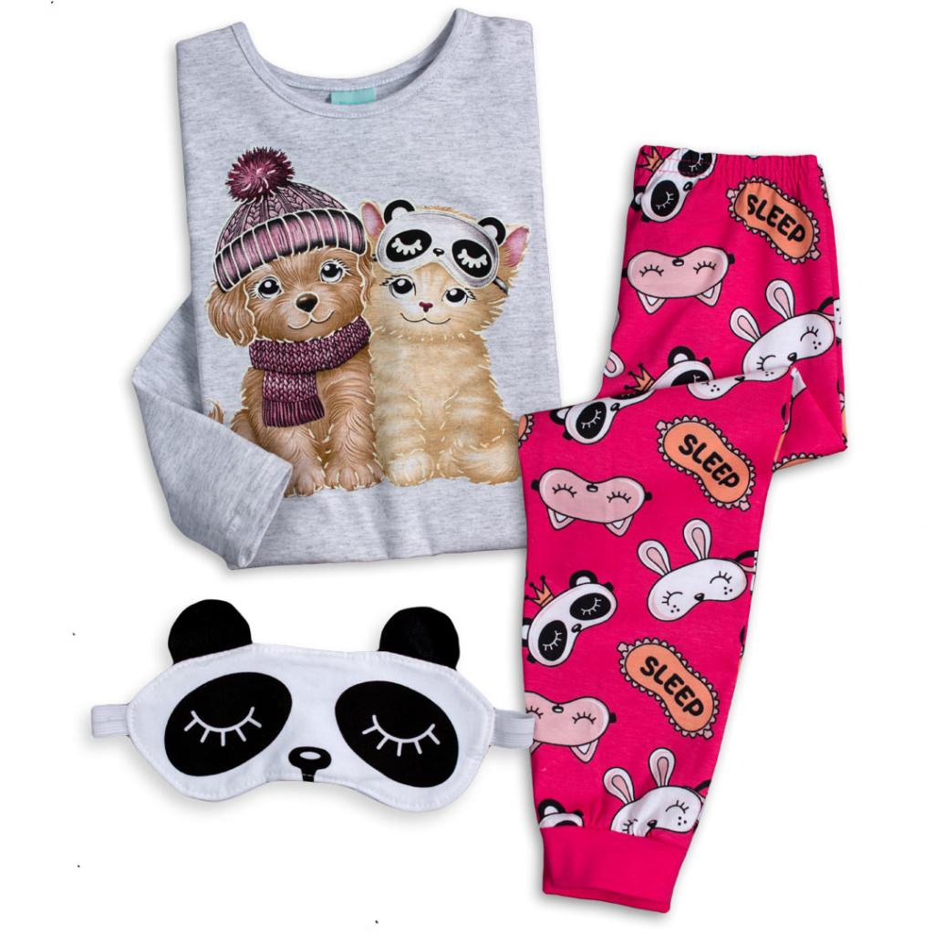 Dievčenské pyžamo s maskou na spanie. Dlhé rukávy i nohavice. Obrysy obrázku na tričku v tme svietia. Vyrobené v Brazílii.Dodatočné parametre