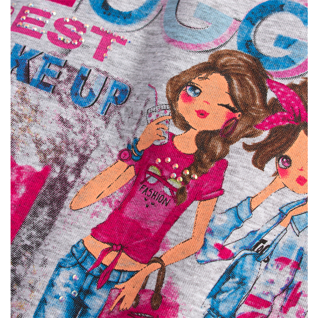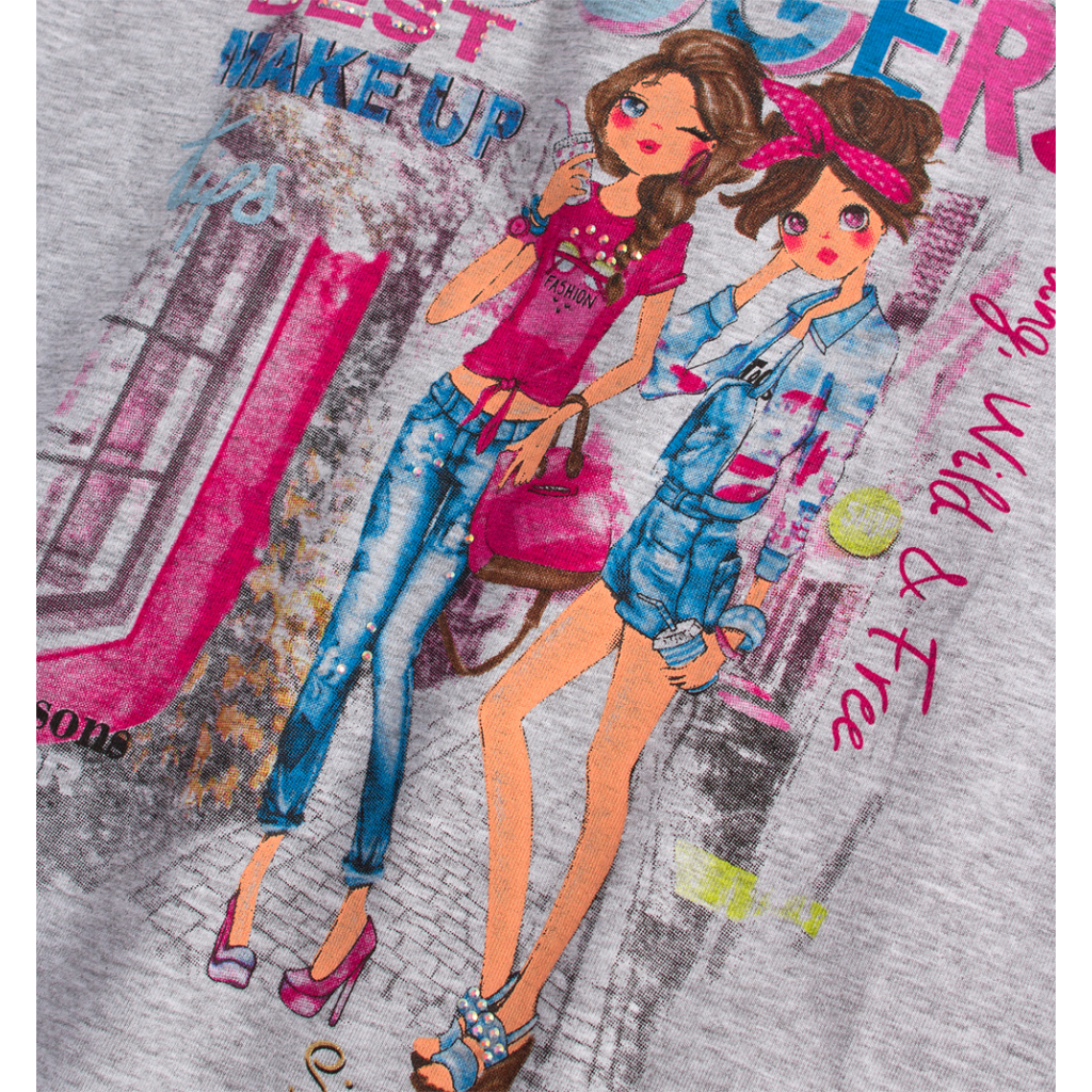 Dievčenská letná súprava. Tričko s krátkym rukávom, s potlačou. Jednofarebné šortky v páse na gumu. Príjemný úplet, dosť pružný.Dodatočné parametre
